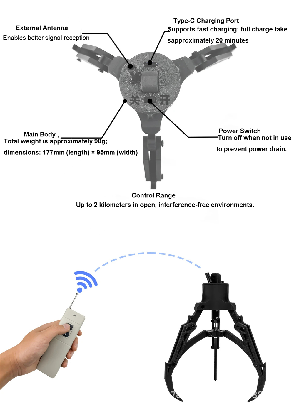 1. Control Method:Controlled by an independent remote. The two buttons on the remote separately control grabbing and releasing.