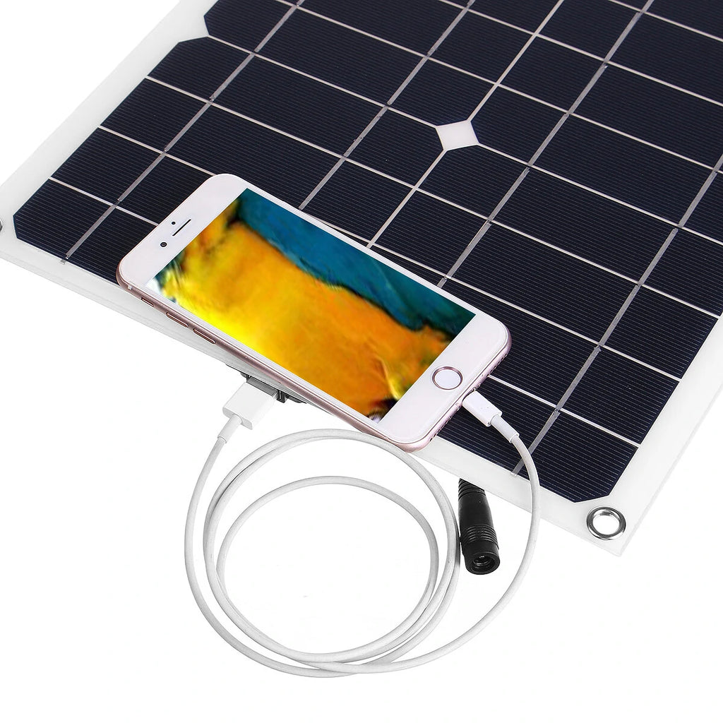 Vpmax: 18V Junction Box: 1xDC + 1xUSB Max USB Output: 5V 2400mA Max DC5.5x2.1 Output: 12V 1200ma Cells: Monocrystalline Efficiency: 21% Rated Power: 30W Material: EVA + PET Size of Panel: 540x280x2.5mm DC Cable Length: 100mm Net Weight: 440G