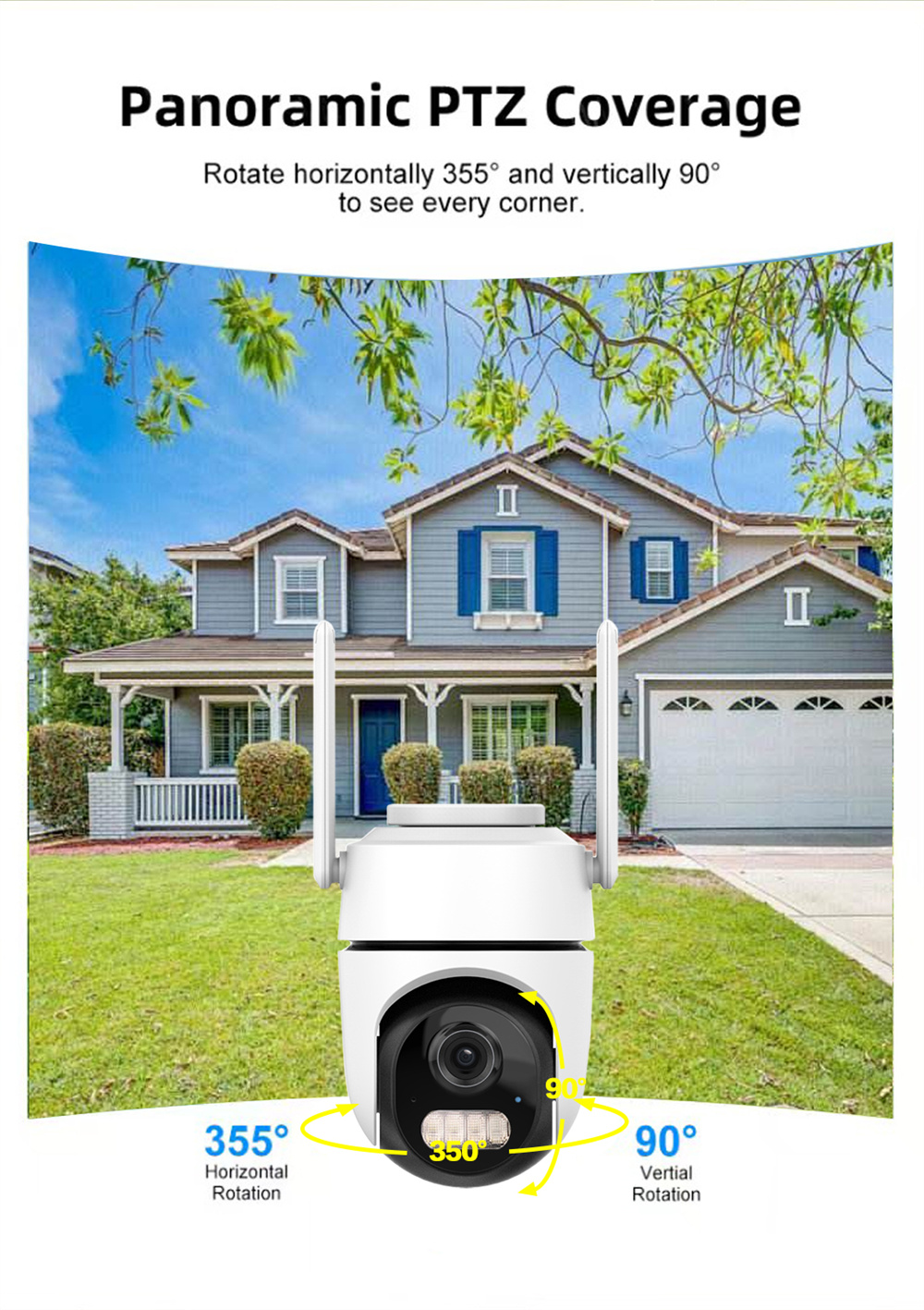 3. Panoramic PTZ View: Rotates 355° horizontally and 90° vertically for wide-area coverage.