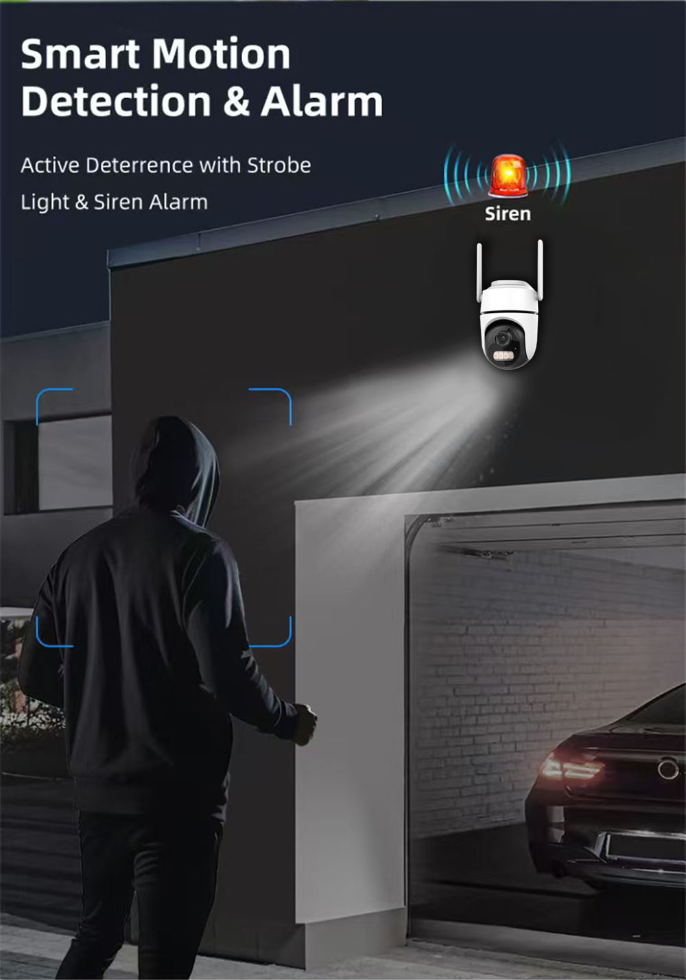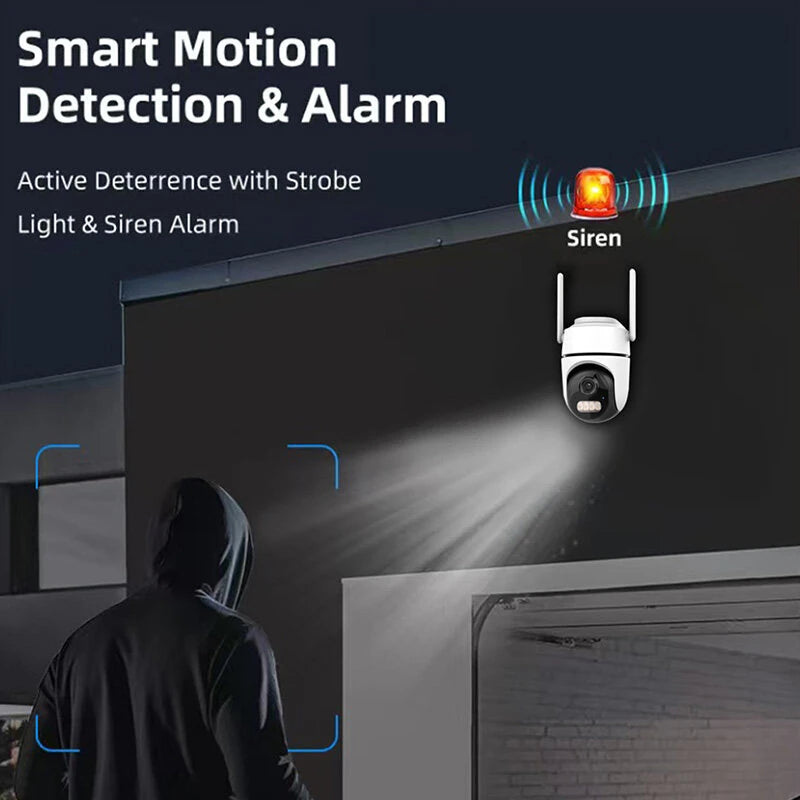 4. Smart Motion Detection: Includes strobe light and siren alarm for active deterrence.