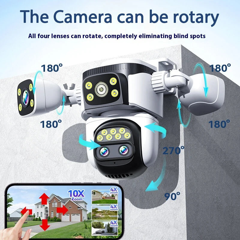 Quad-lens design for 360-degree monitoring and multi-angle view.