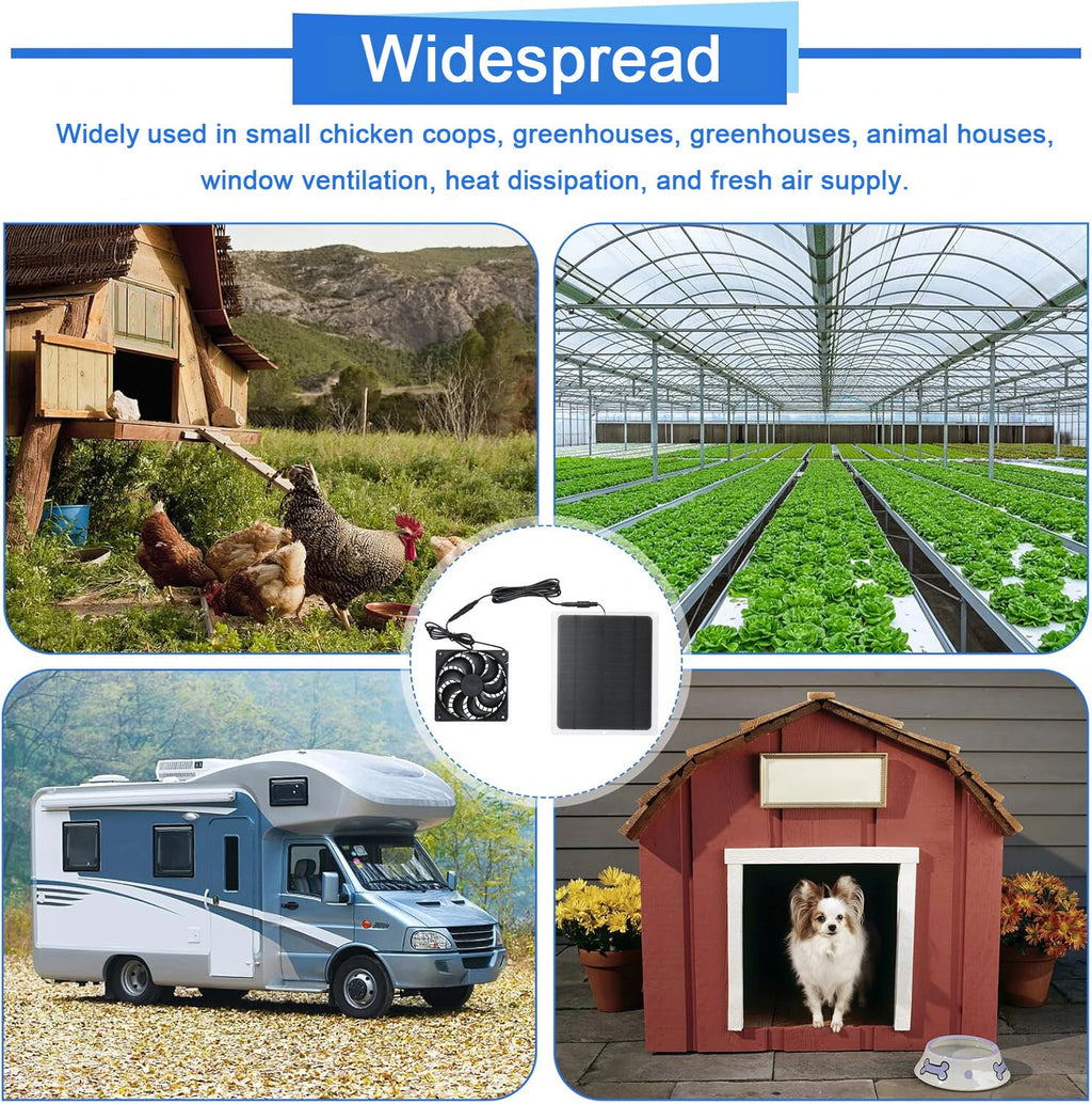 Solar panel fans can circulate hot air and cool air, effectively reducing indoor temperature and keeping the air fresh. This is the ideal solution for small chicken houses, greenhouses, sheds, pet houses, and window exhaust pipes in hot summer days.