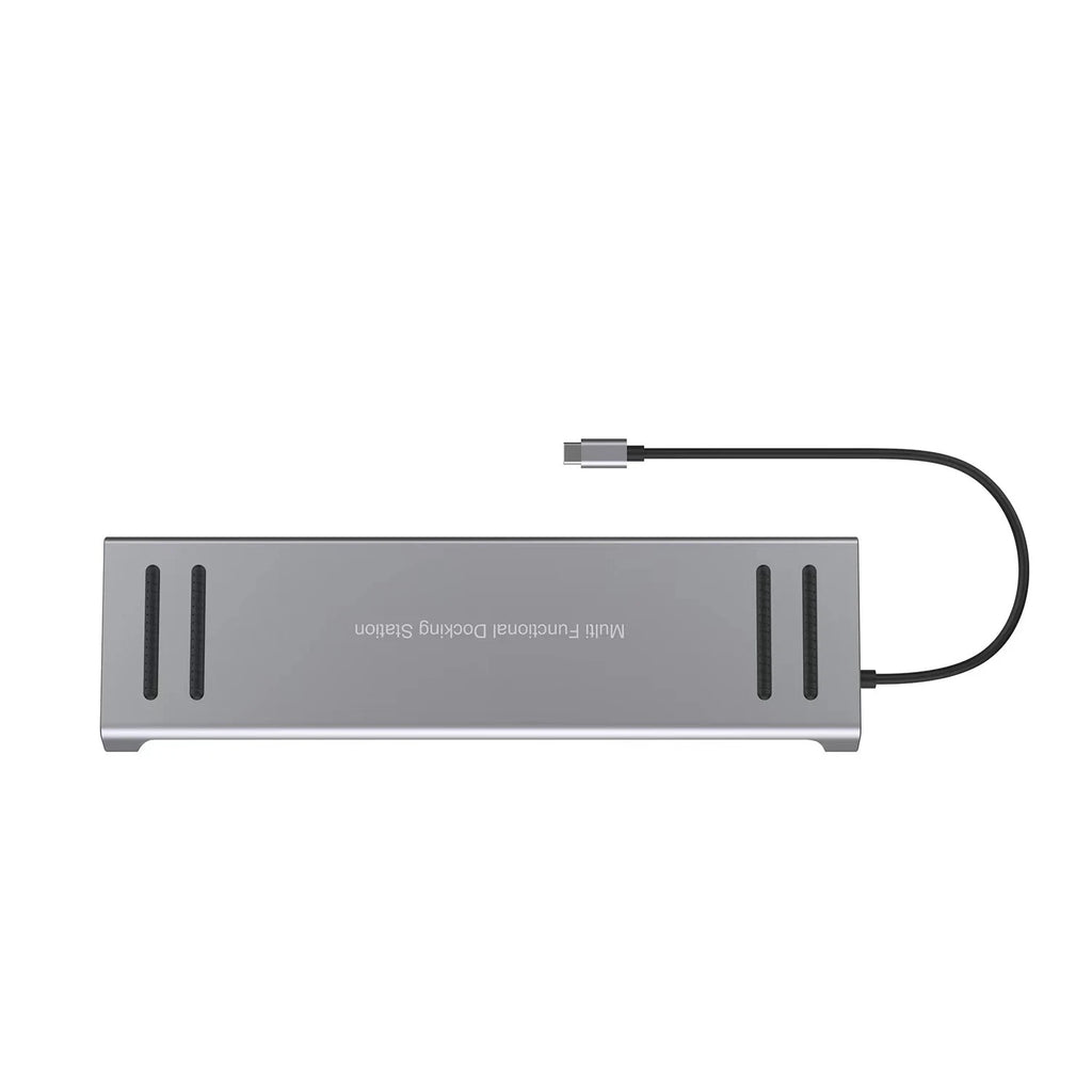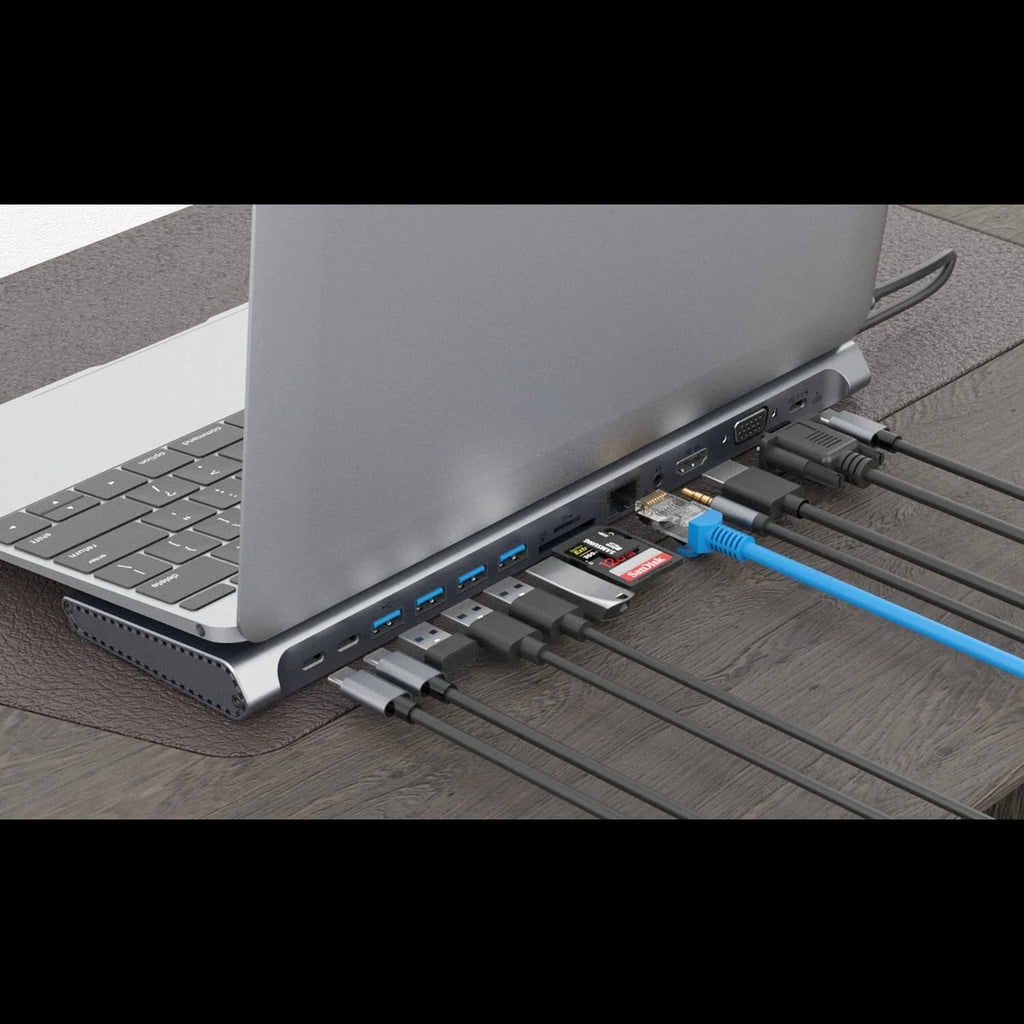 1. Full-featured and usable docking station: Function Charging, data transfer, audio output, ethernet, card reader, USB-C (100W PD male)×1, USB 3.0×1,USB2.0*3, USB-C×2, SD×1, TF×1, HD×1,VGA×1, RJ 45×1, 3.5mm JACK×1.
