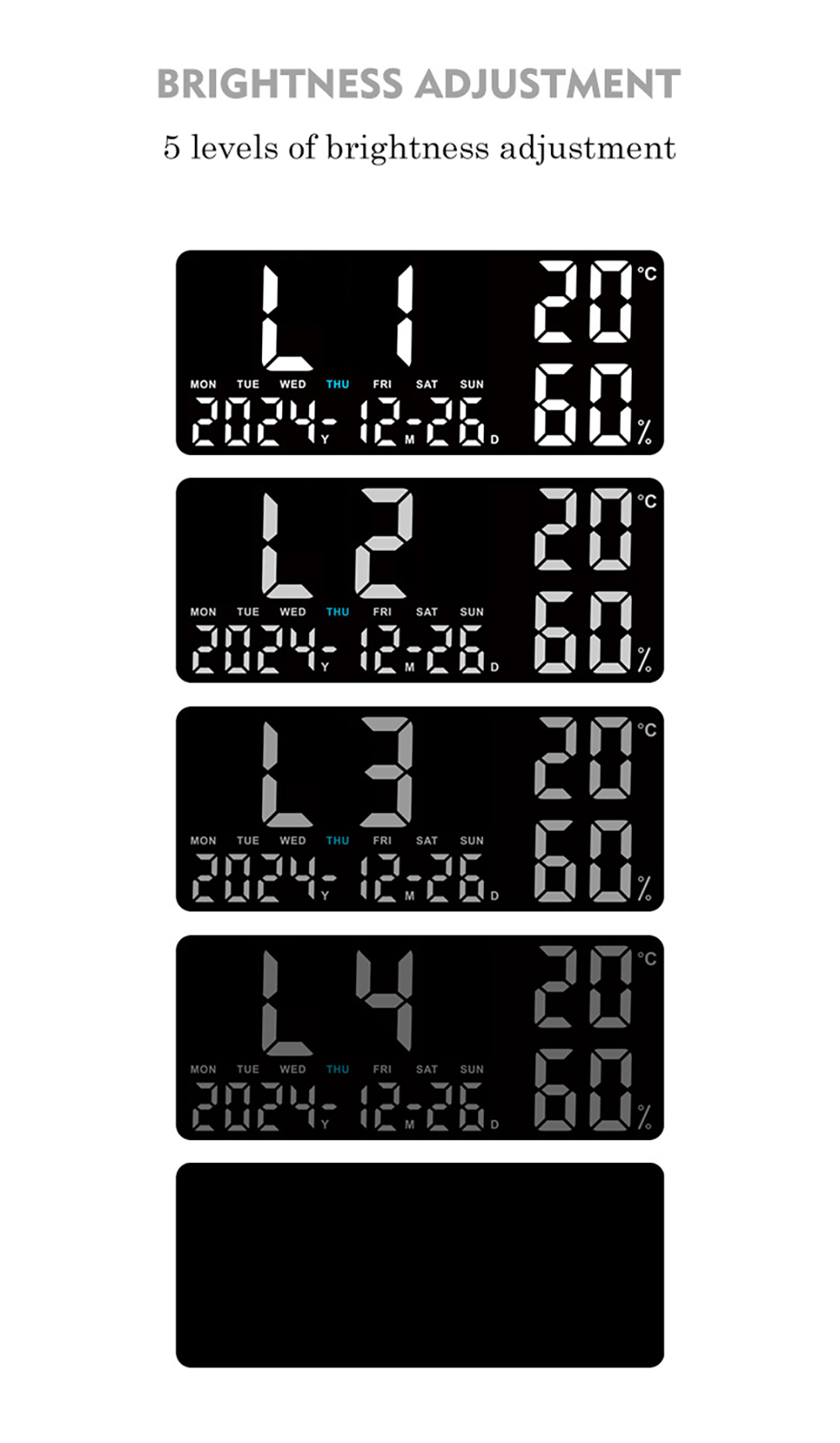 Featuring five brightness settings, this clock's display can be adjusted to fit various lighting conditions and preferences. Whether you need a bright display during the day or a dimmer one for night, it caters to all needs.