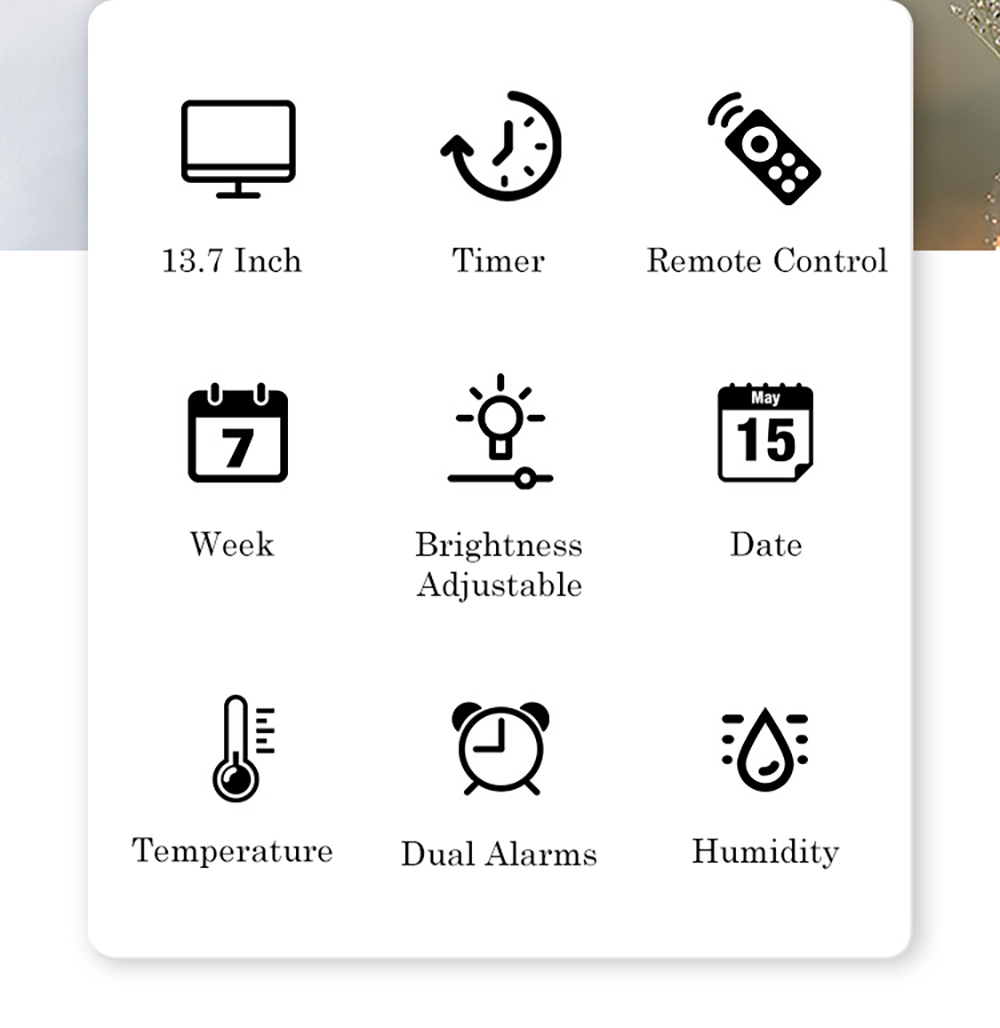 Functionality: Timer, Remote control, Weekday display, Date display, Brightness adjustment, Temperature display, Humidity display, Dual alarm, Celsius/Fahrenheit switch