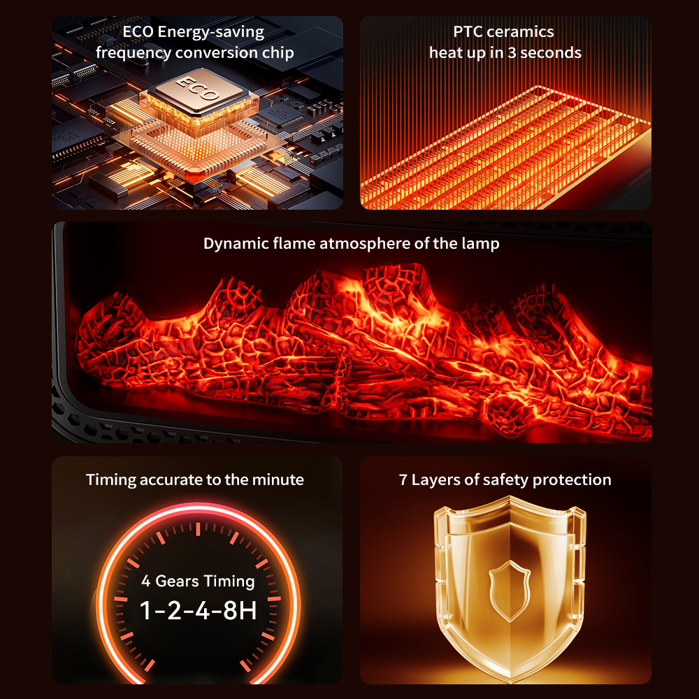 Equipped with an easy-to-use, 4-gear timing function, you can set the Flame Heater to operate for 1, 2, 4, or 8 hours. This flexibility enhances convenience and energy savings, letting you run the heater for just the right amount of time needed to keep your space comfortable without unnecessary energy consumption.
