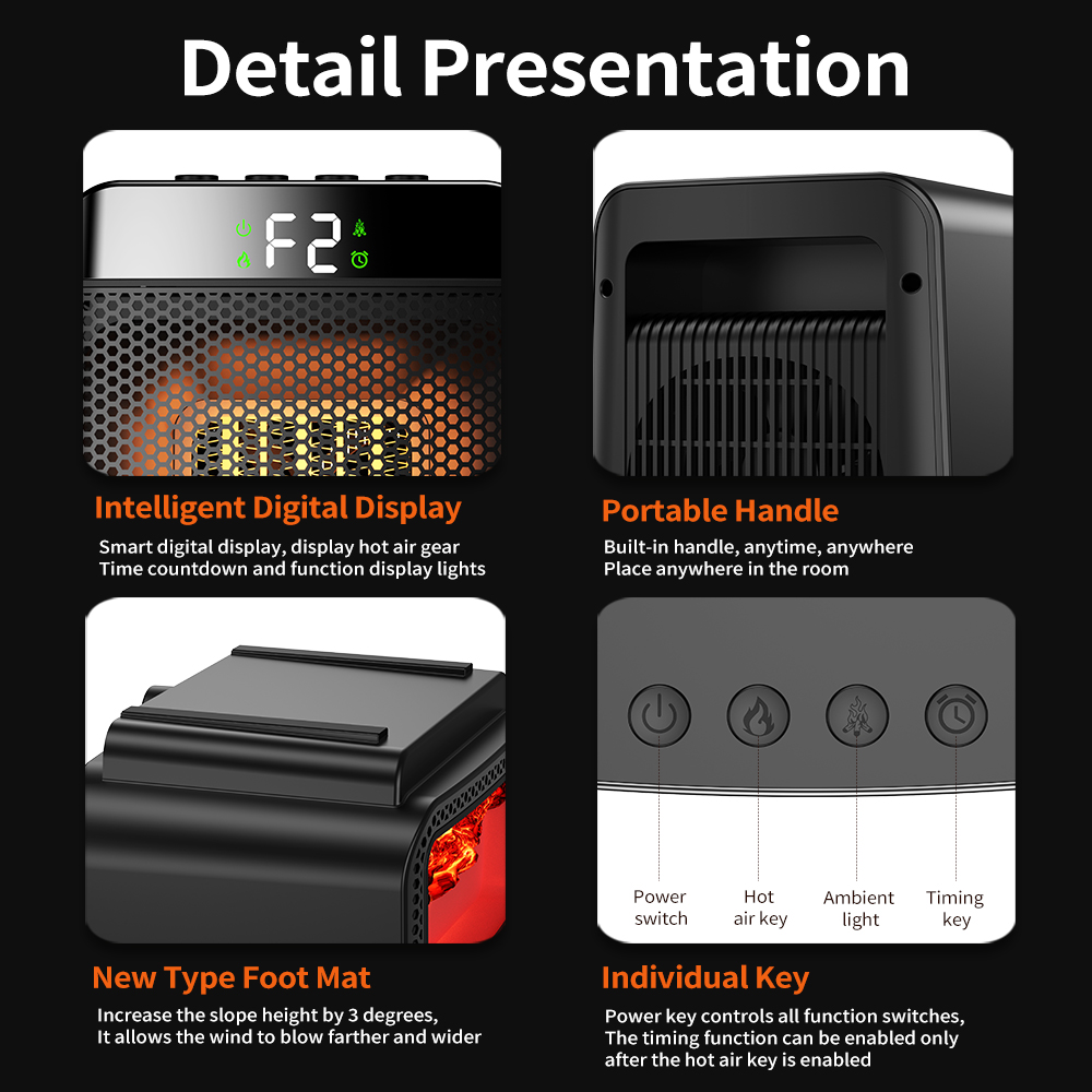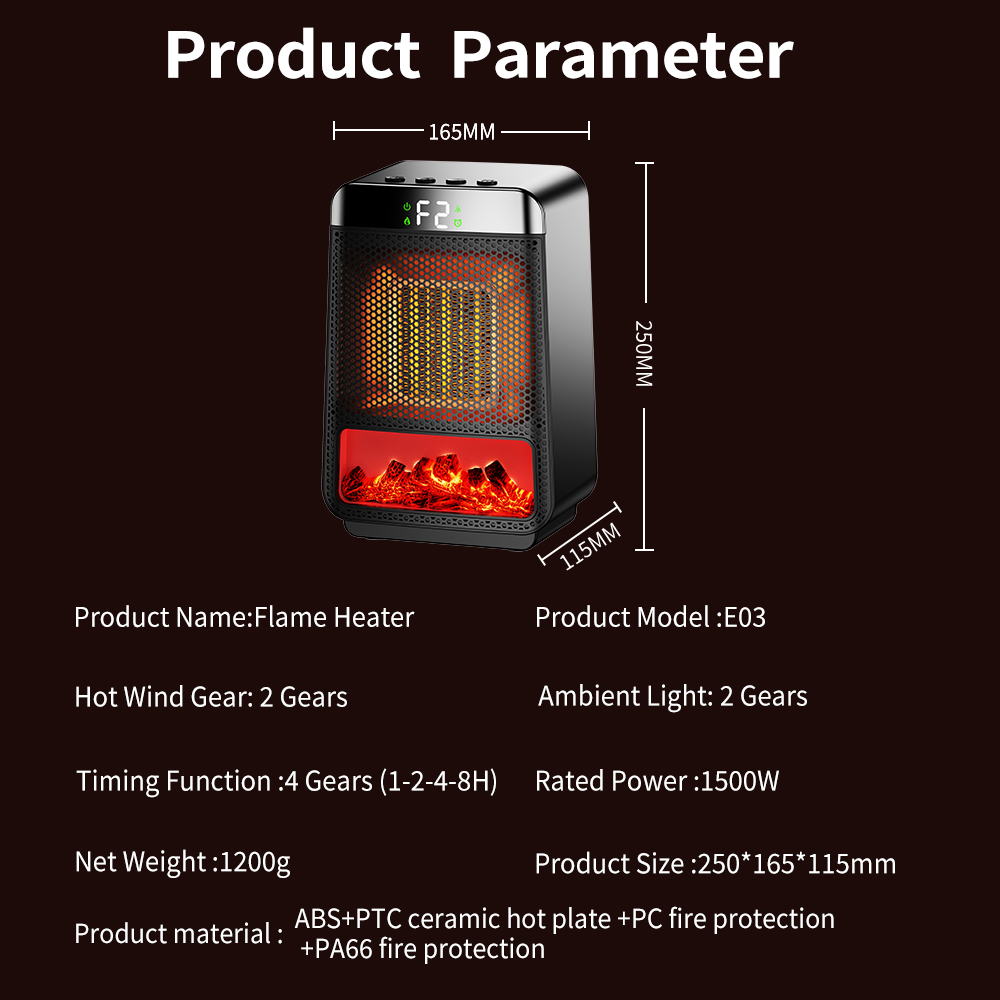 Crafted from high-quality materials such as ABS, PTC ceramic, PC fire protection, and PA66 fire protection, the Flame Heater is built with safety in mind. These fire-resistant materials reduce the risk of accidents, providing peace of mind as you enjoy the warmth. The sturdy construction ensures long-lasting use, making it a reliable addition to your home heating solution.