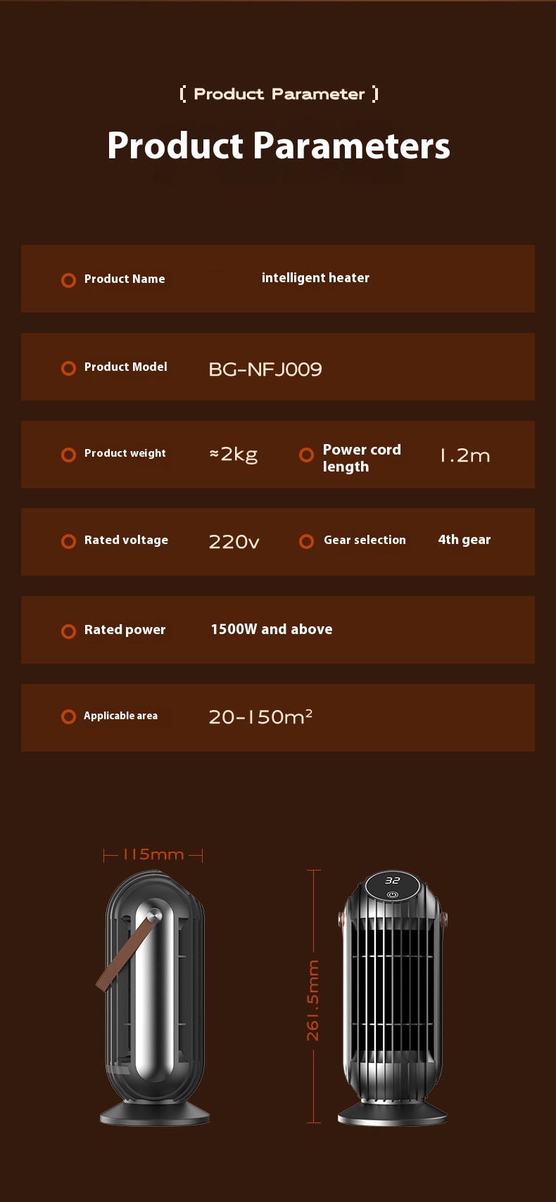 - Energy-Efficient Performance: The heater operates at a rated power of 1500W or higher, offering powerful heating while optimizing energy consumption, making it suitable for areas ranging from 20 to 150m².