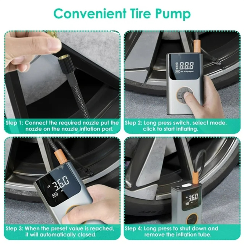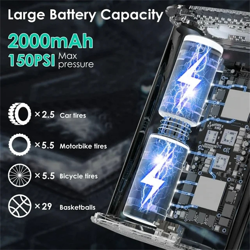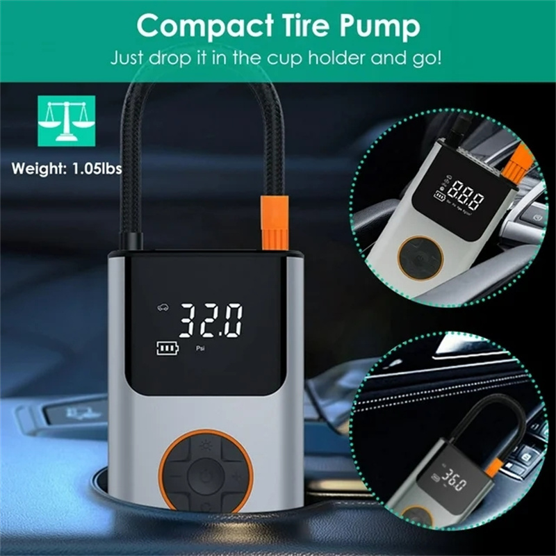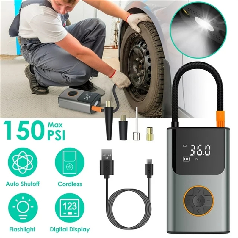 When the Air Is Low, Pump It Up Skip the trip to the gas station and reach for the powerful, portable cordless inflator that fits in the palm of your hand with the Cordless Digital Inflate. Compact and convenient for camping or commuting, it's the power-packed rechargeable pump that's perfect anywhere power is at a premium like in the store parking lot, off-roading, or on the daily drive. You can set the pressure value manually between 0-150PSI and it will stop working automatically after reaching the set value. In addition, the air compressor comes with an LED-lighting feature to support your inflating needs in a low-light environment and a red SOS light for seeking help. This multi-purpose can work as an emergency power bank to charge your phones. It’s not limited to car tire inflation but also be applied to bicycles, motorbikes, and different kinds of balls.