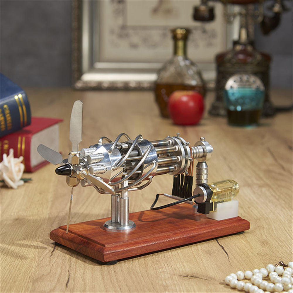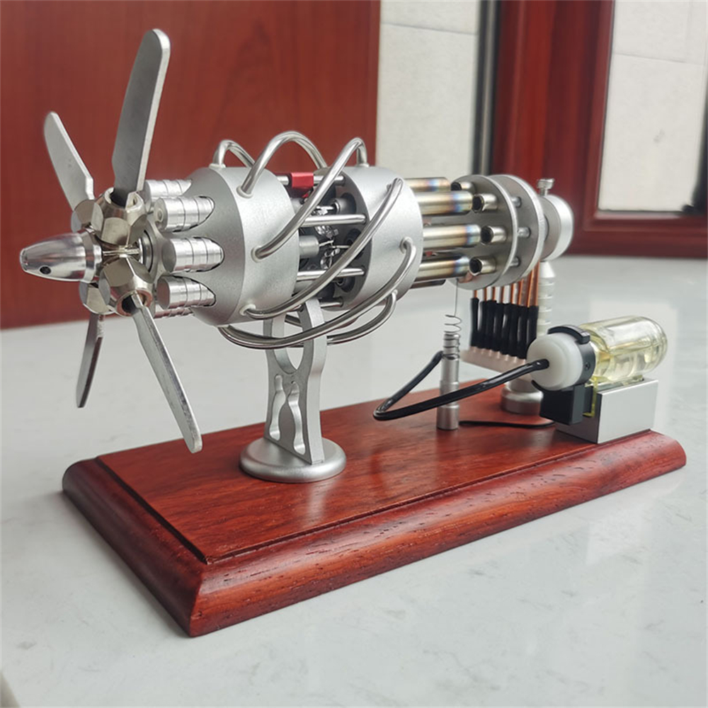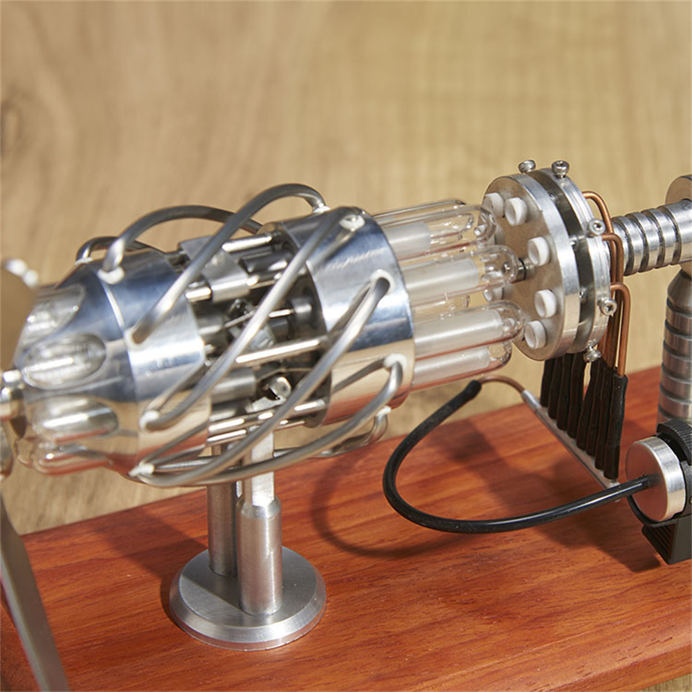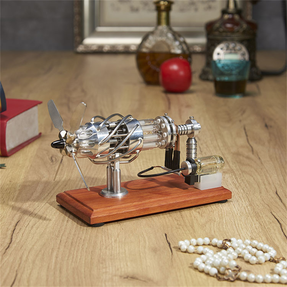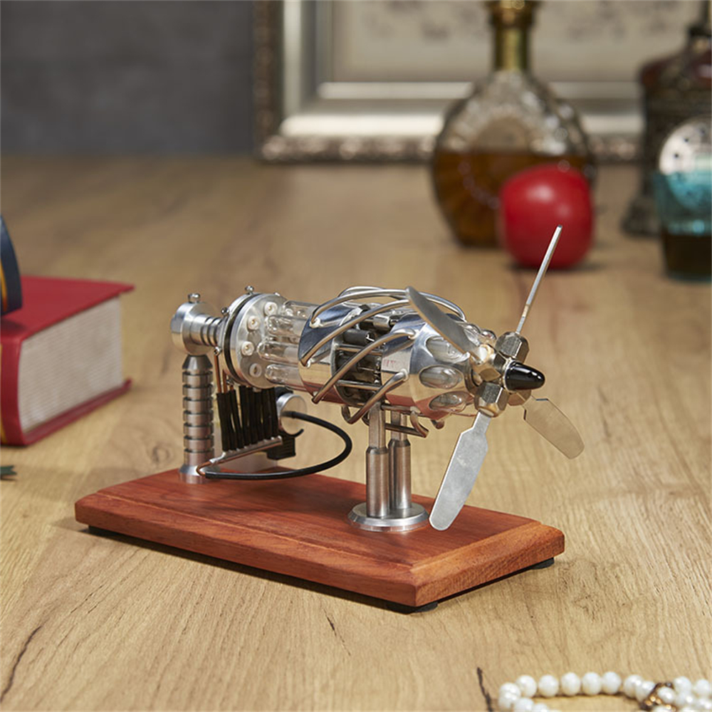 -This is an external combustion engine in which the fuel is burned continuously, and the piston is moved by the expansion of air as a medium, and the expansion gas is cooled in the cold chamber, and the cycle is repeated. Only a small alcohol lamp, you can make it fast rotation and strong power.-As the external combustion engine to avoid the traditional internal combustion engine of the explosion to do work, in order to achieve a high efficiency, low noise, low pollution and low operating costs.-The biggest advantage of the external combustion engine output and efficiency from the influence of altitude, very suitable for high altitude areas.- Aerodynamics are rich in knowledge of physics, Engine principle is intuitive, educational toys, teaching experimental equipment can effectively cultivate children's interest in learning can also be used for classroom teaching, more intuitive and easy to understand.-A floating bead links 8 cylinders and its piston to drive based on the motor power from hot air, hard to believe it is a engine model, super cool,8 cylinders, 8 heating tube-8 fire-outlet sparks the fire flame to the quartz tube ( Or stainless heating tube ) , cool