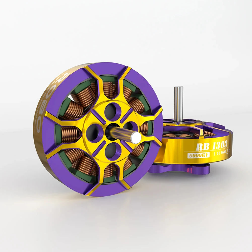 The FLYWOO RB 1303 motor adopts a new structural design with a dual bearing design. This dual bearing design enables better control of shaft movement, reducing noise and vibration. It enhances stability and is more power-efficient. The motor is made of 7075 aviation aluminum material, features a high-efficiency magnetic circuit design, has a dual-color oxidation appearance, a wire soldering pad design, weighs only 6.1g, offers efficient power, smooth operation, and stable control. It is very suitable for whoop and toothpick models.