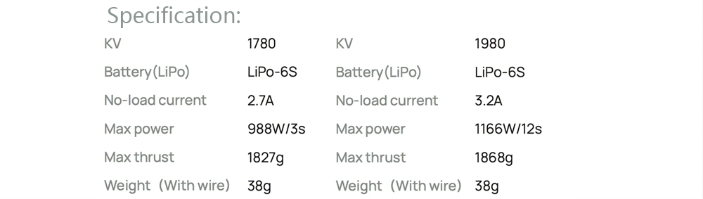 KV: 1780 Battery(LiPo): LiPo-6S No-load Current: 2.7A Max Power: 988W/3s Max Thrust: 1827g Weight (With Wire): 38g |