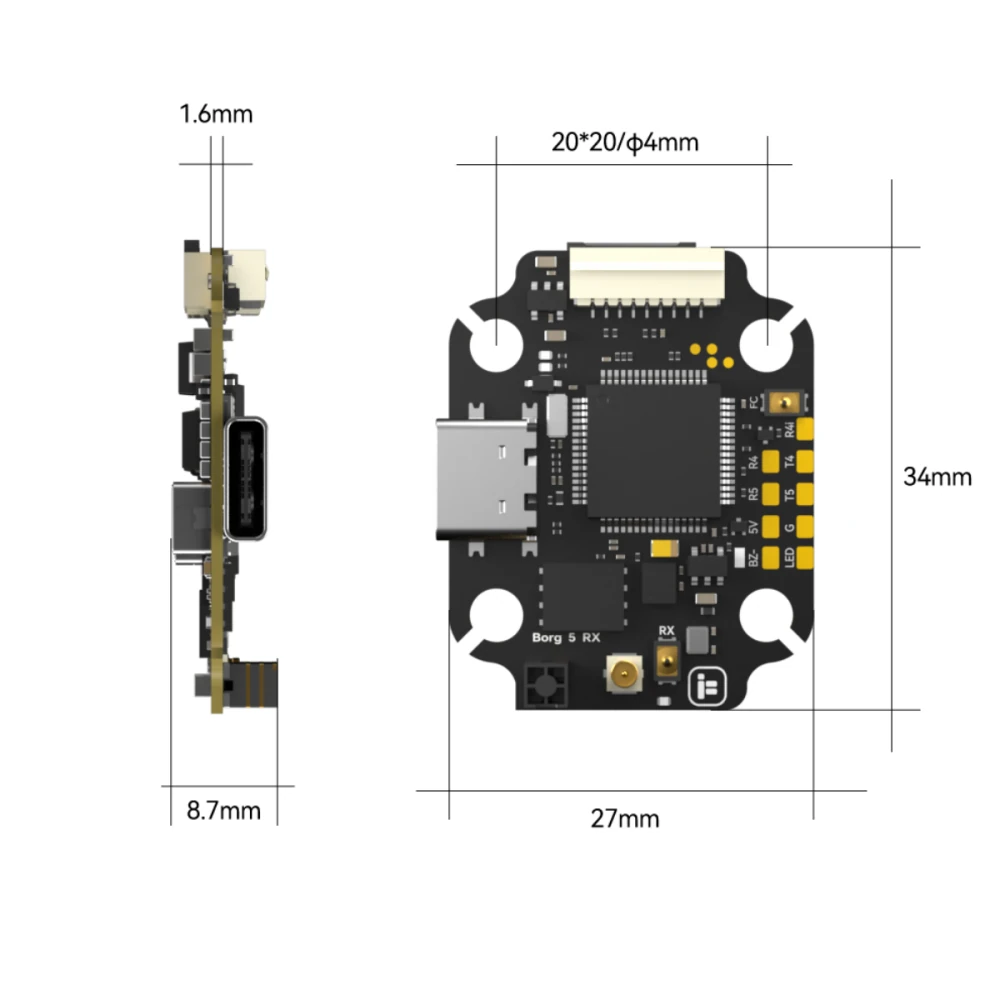 Introducing the All-New Borg Series – Power Meets Precision!The Borg 5S RX FC Flight Controller is specifically designed for racing fpv, providing unmatched performance. This innovative controller features a built-in ELRS 2.4GHz receiver and an integrated antenna, ensuring a reliable connection and enhanced control during your flights. Additionally, the Borg 5S RX FC offers the flexibility to support external receivers, allowing you to customize your setup to meet your individual racing needs. Elevate your racing experience with the cutting-edge technology of the Borg Series!