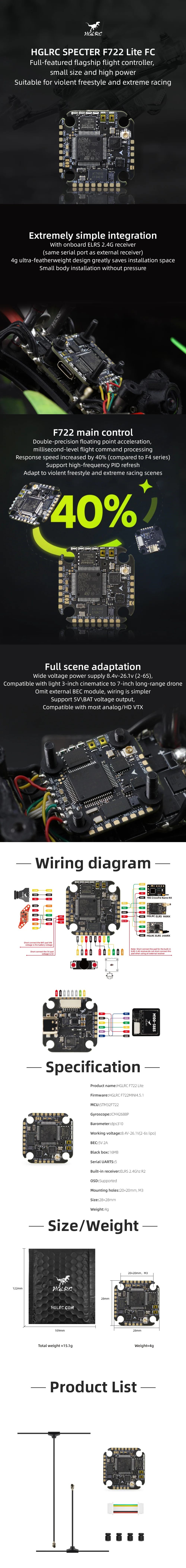 * Minimal integration: The flight control comes with an onboard ELRS 2.4G receiver, and an external receiver is also available. The 4g ultra-featherweight design greatly saves installation space, and the small fuselage can be installed without pressure