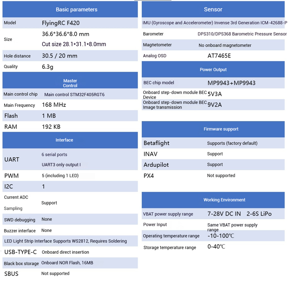 Model: FlyingRC F420 Dimensions: 36.6x36.6x8.0mm Cut Size: 28.1x31.1x8.0mm Hole Distance: 30.5 / 20mm Weight: 6.3g |