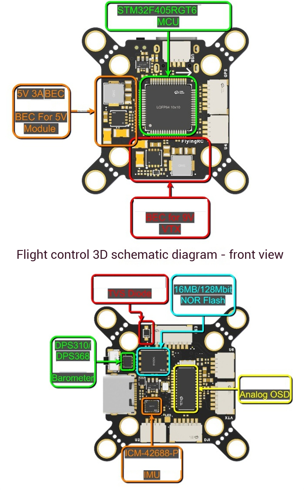 - Equipped with STM32F405RGT6 MCU, supporting AP, BF, and INAV firmware; pre-flashed with BF firmware at factory.