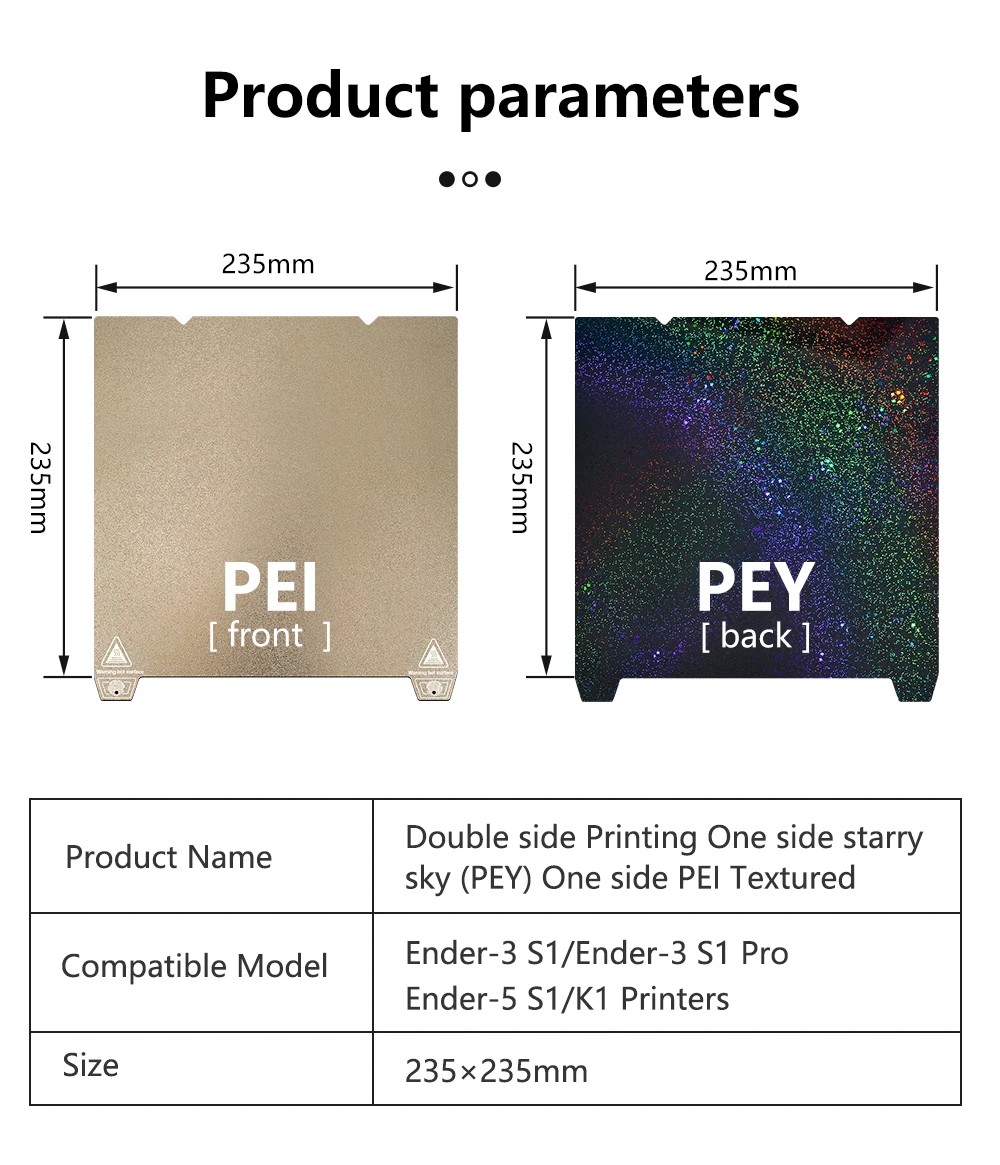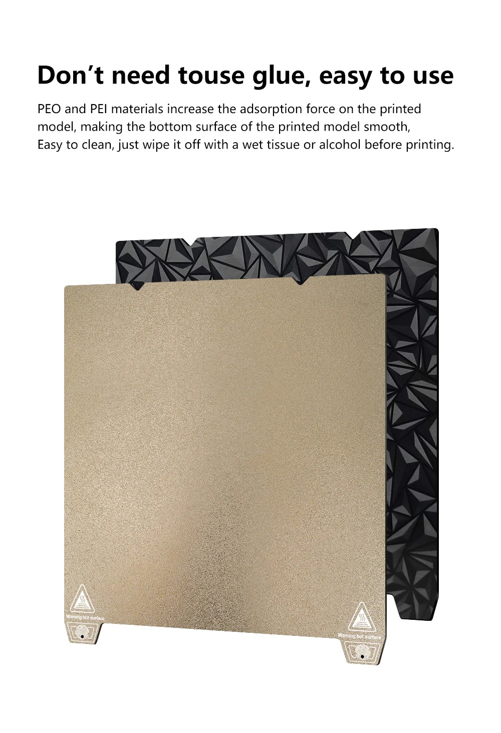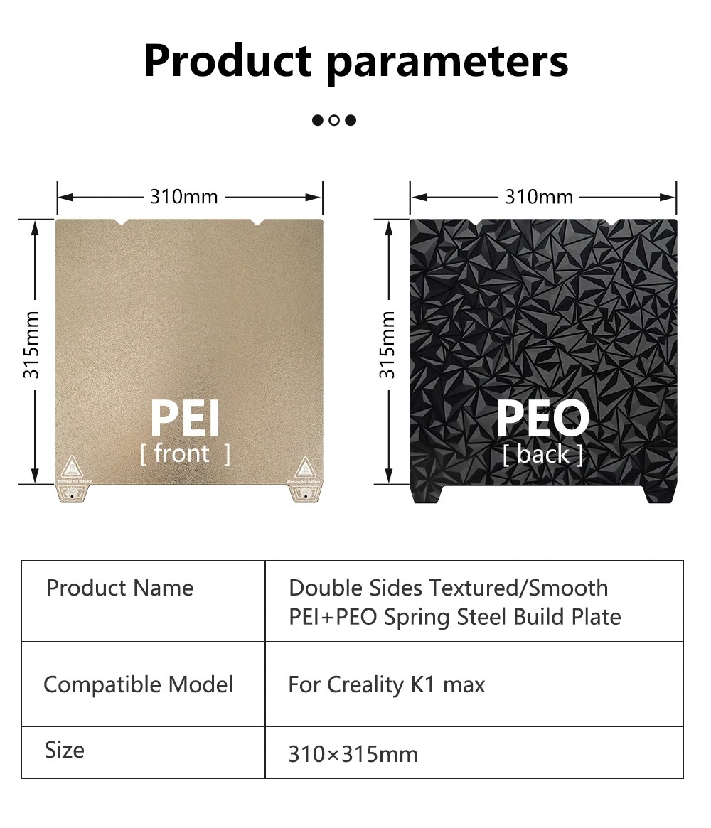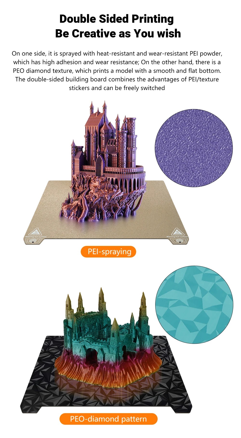 1. Double-Sided Printing: One side textured PEI for textured bases, and the other side smooth PEO surface for flat finishes.