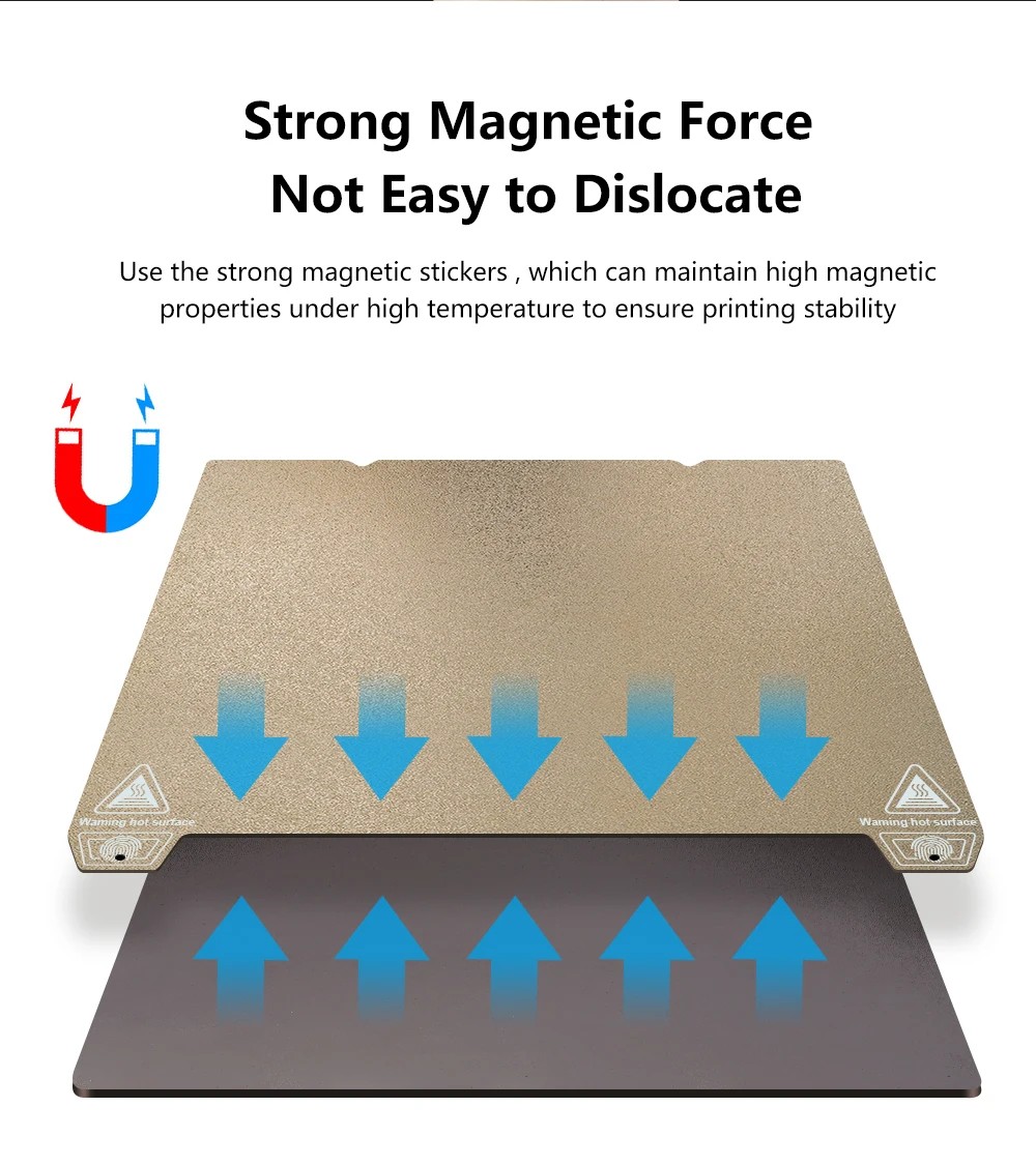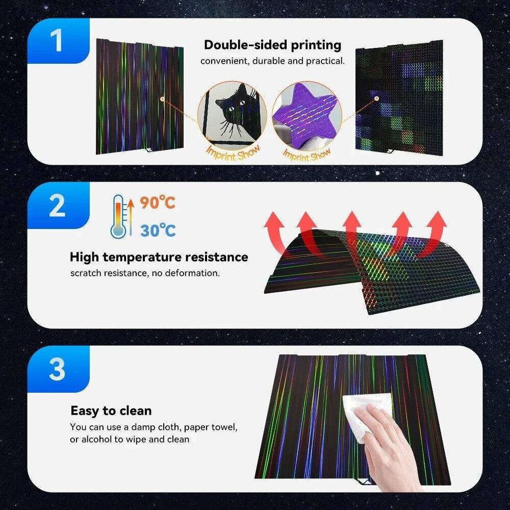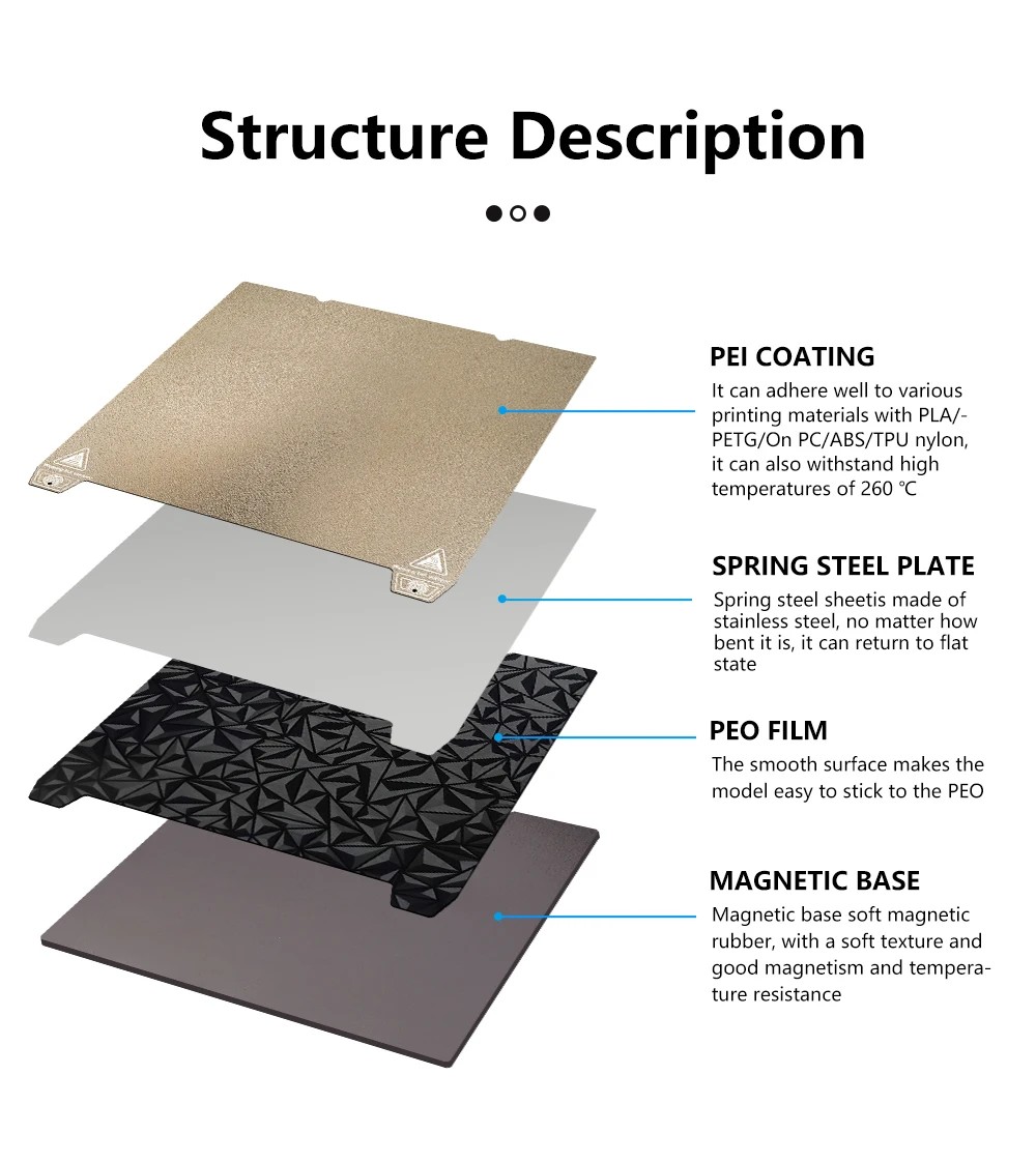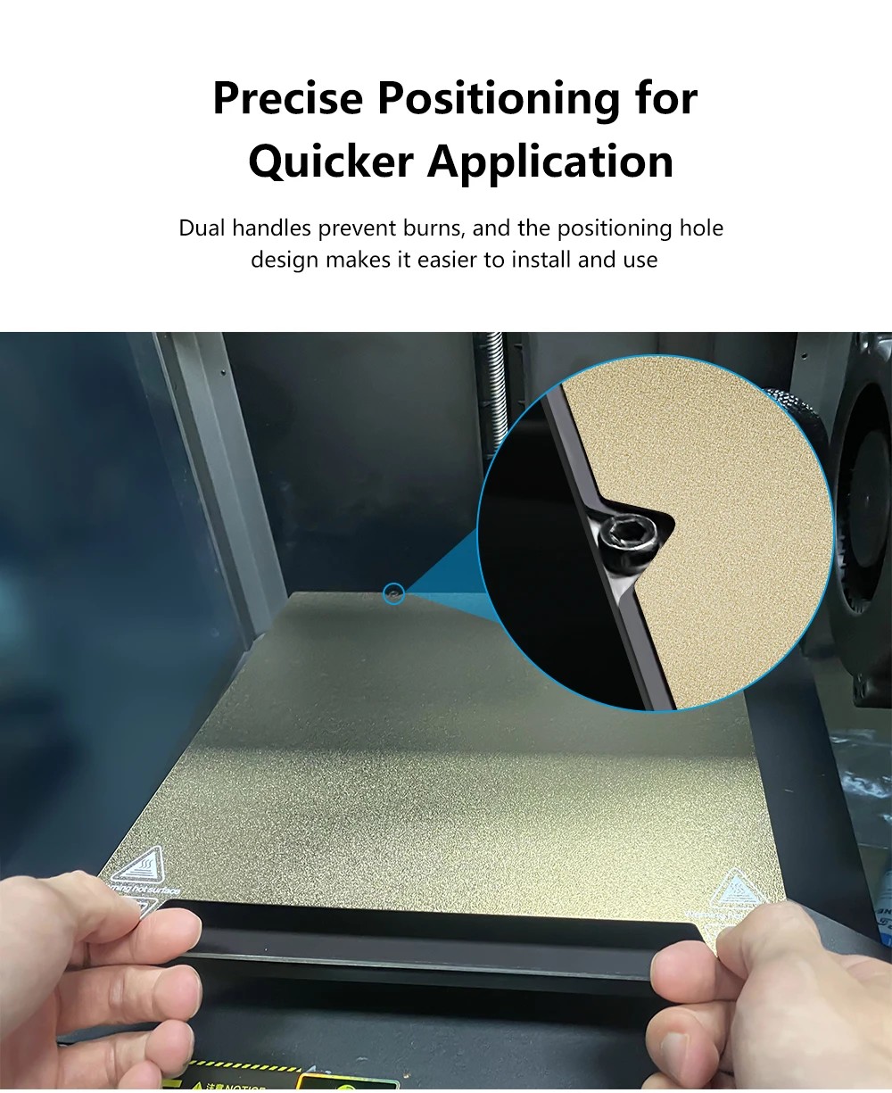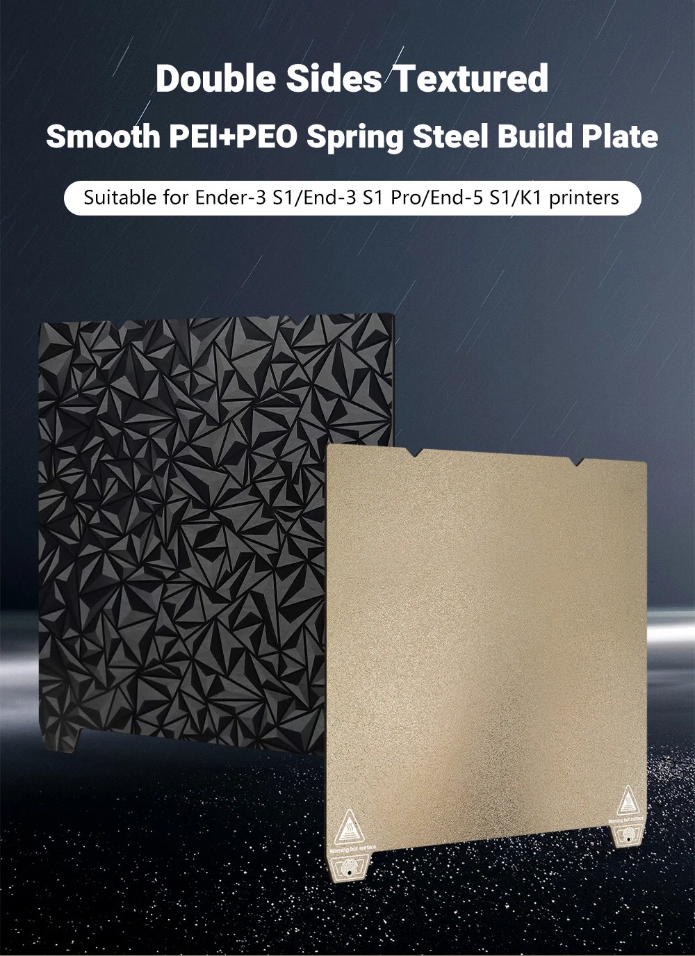 1. Double-Sided Printing: One side textured PEI for textured bases, and the other side smooth PEO surface for flat finishes.