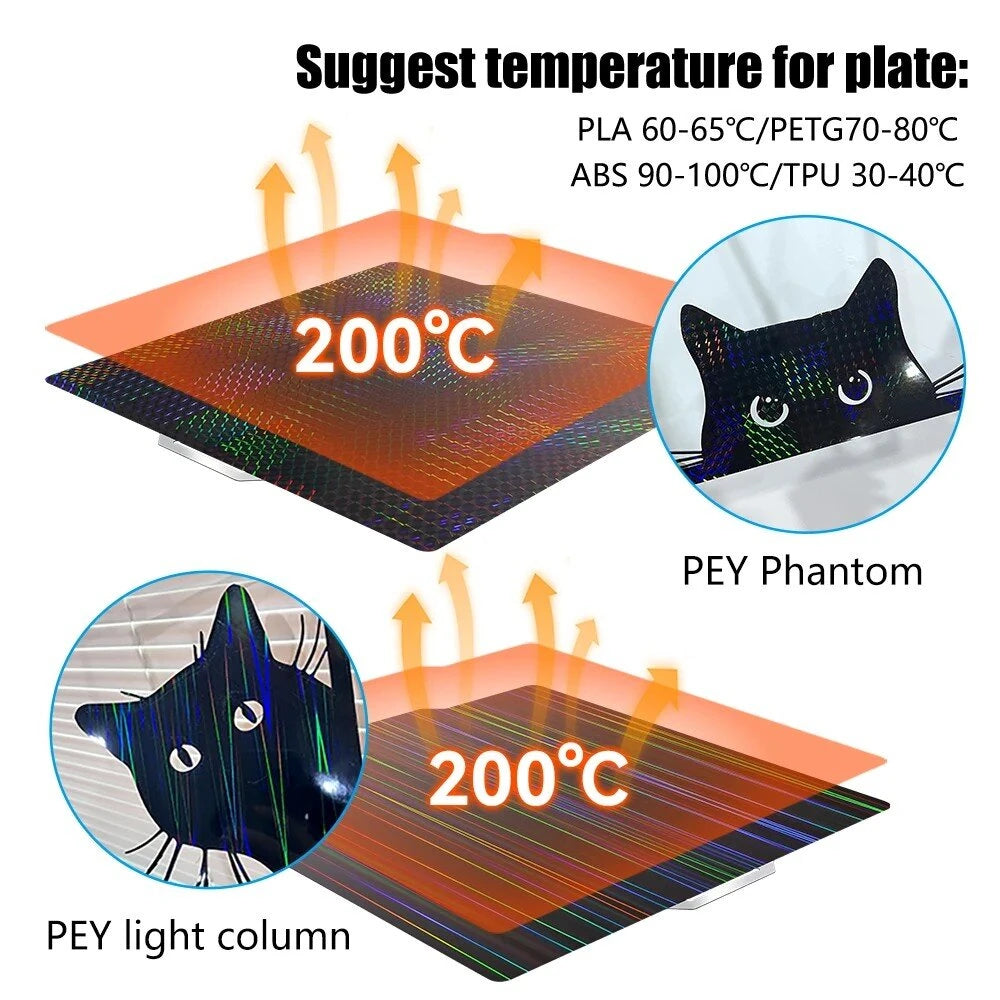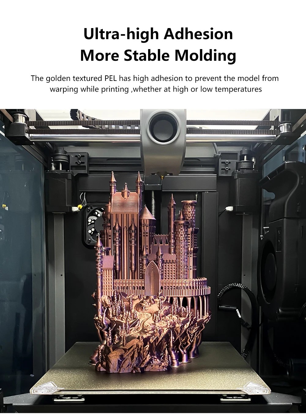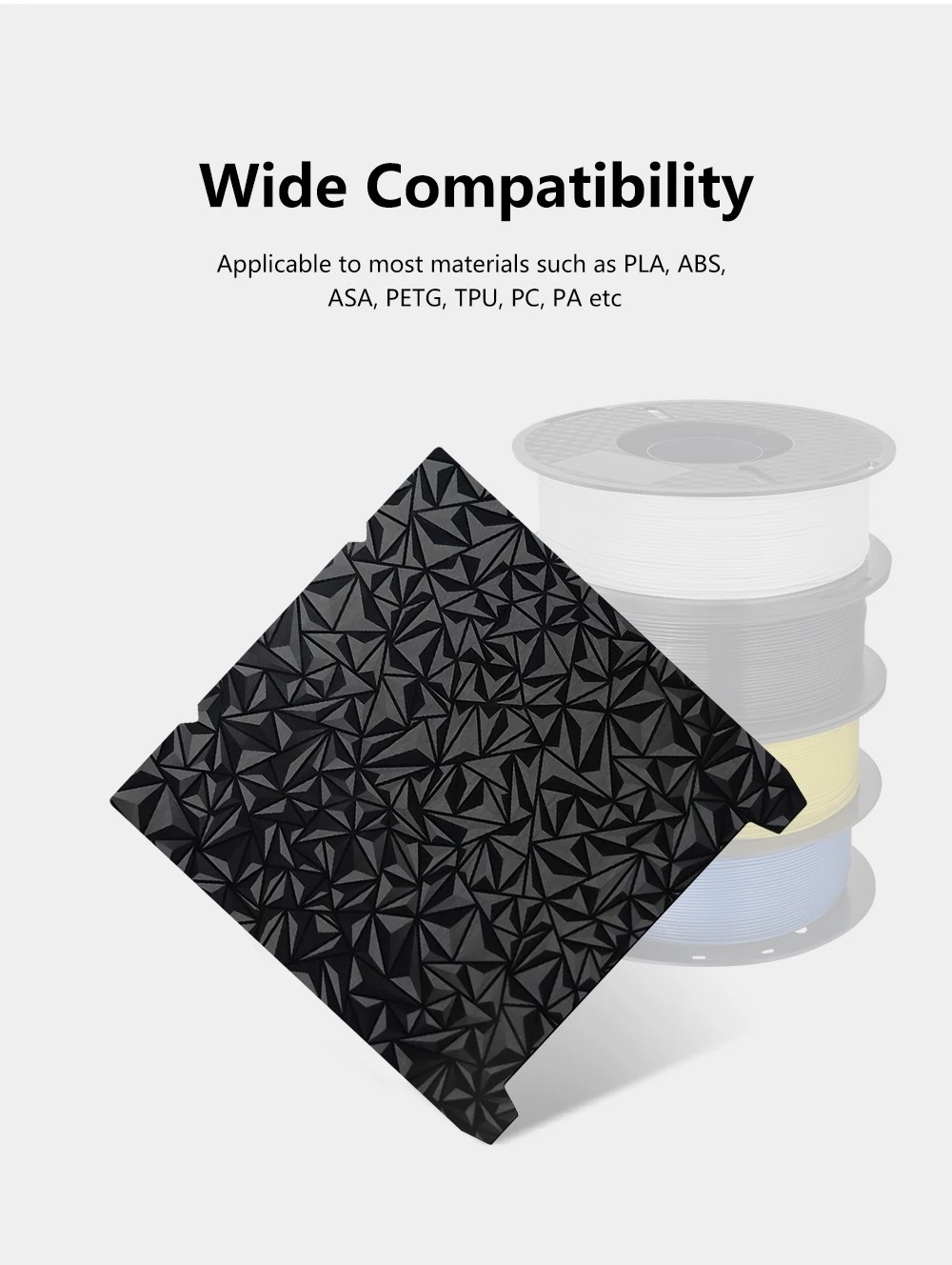 Adhesion: Enhanced materials provide excellent adhesion for various filaments like PLA, PETG, ABS, ASA, TPU, PC, etc.