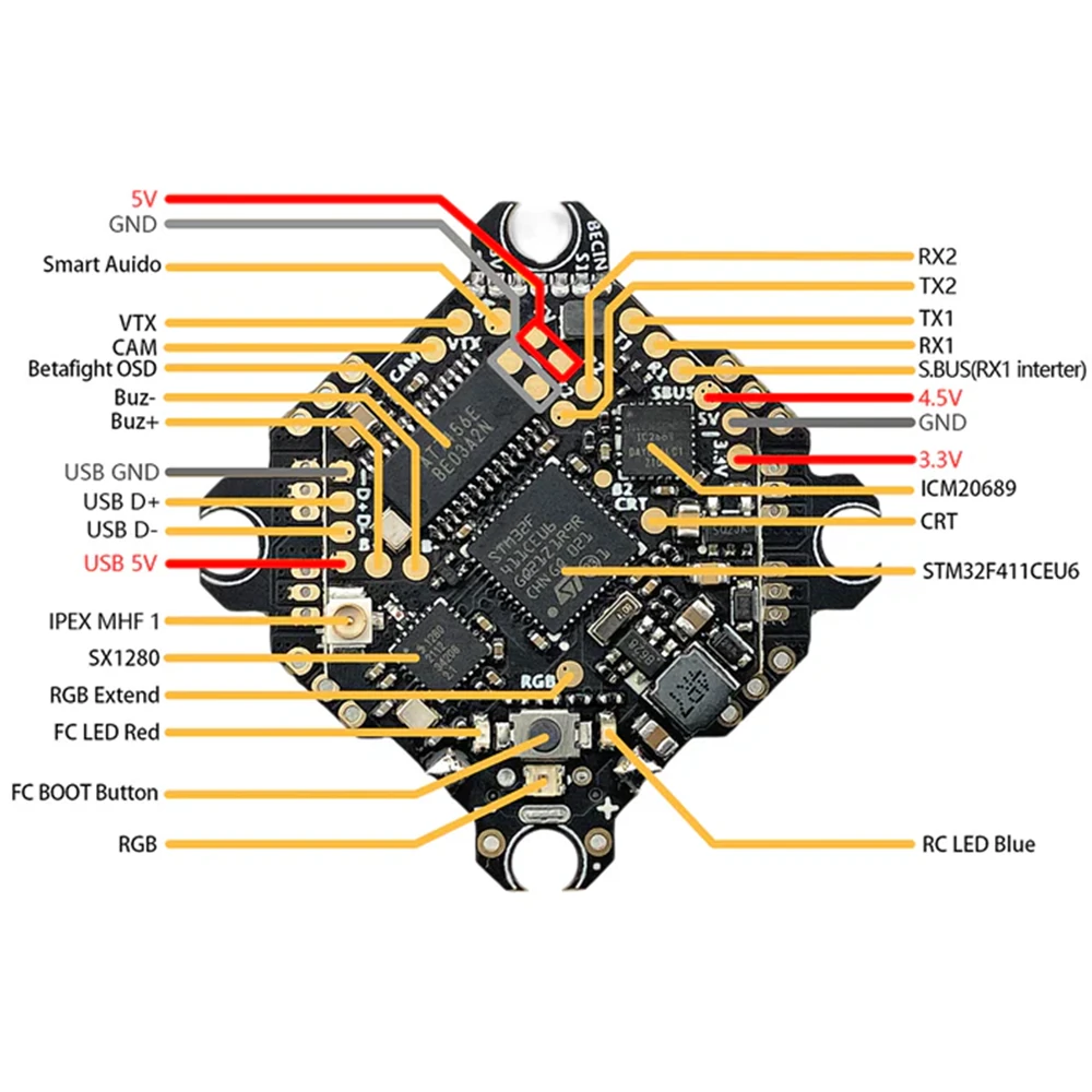 Input Voltage: 1-3S LipoFC Main Control Chip: STM32F411Gyro: MPU6500OSD: AT7456EBlack Box: NoneBarometer: NoneBluetooth: NoneReceiver: On board SPI ELRS 3.x Version 2.4G ReceiverBEC: 5V/2AUSB Interface: 1x Micro USBSerial Port: UART1,UART2Soft Serial Port: NoneRSSI: NoneRGB: Onboard 1 xRGBBuzzer: 1x BB-FC Firmware: DARWINF4SX1280HD(BetaFlight)ESC Main Control Chip: EFM8BB21 (8bit 48MHz)Continuous Current: 4x15APeak Current: 4x17A (5S)Support Throttle Protocol: Dshot 150/300/600Galvanometer: NoneTelemetry: NoneESC Firmware: S_H_50 (BlueJay)ESC Power Cable: #20AWG /70mm