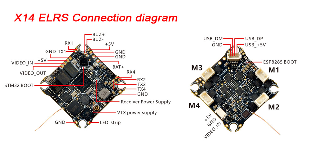 X14 ELRS flight controller is the updated version for X12ELRS PRO, this flight controller is based on STM32G473 MCU, provide more UARTs, built-in 12A 4-IN-1 ESC and Serial ELRS receiver, also comes with OPENVTX max power up to 400mw. It’s a good option for 75mm/85mm 2S whoops building.