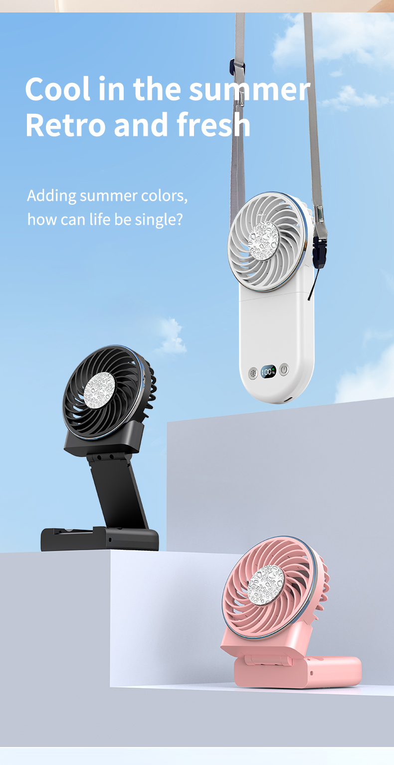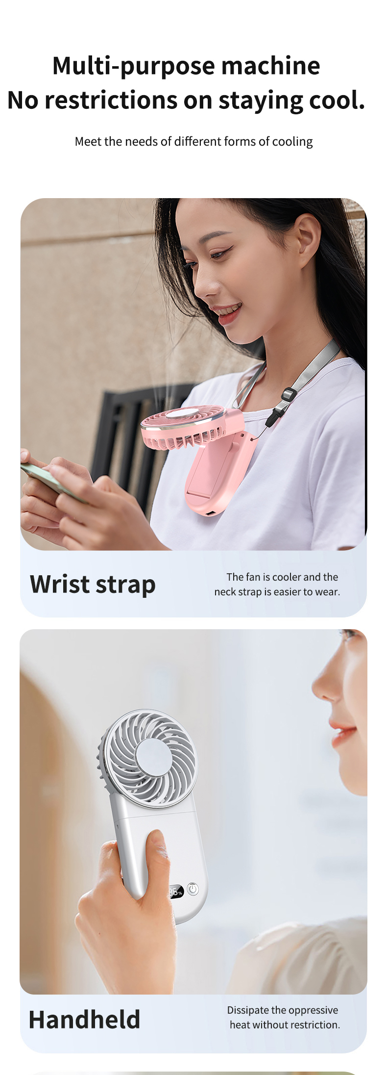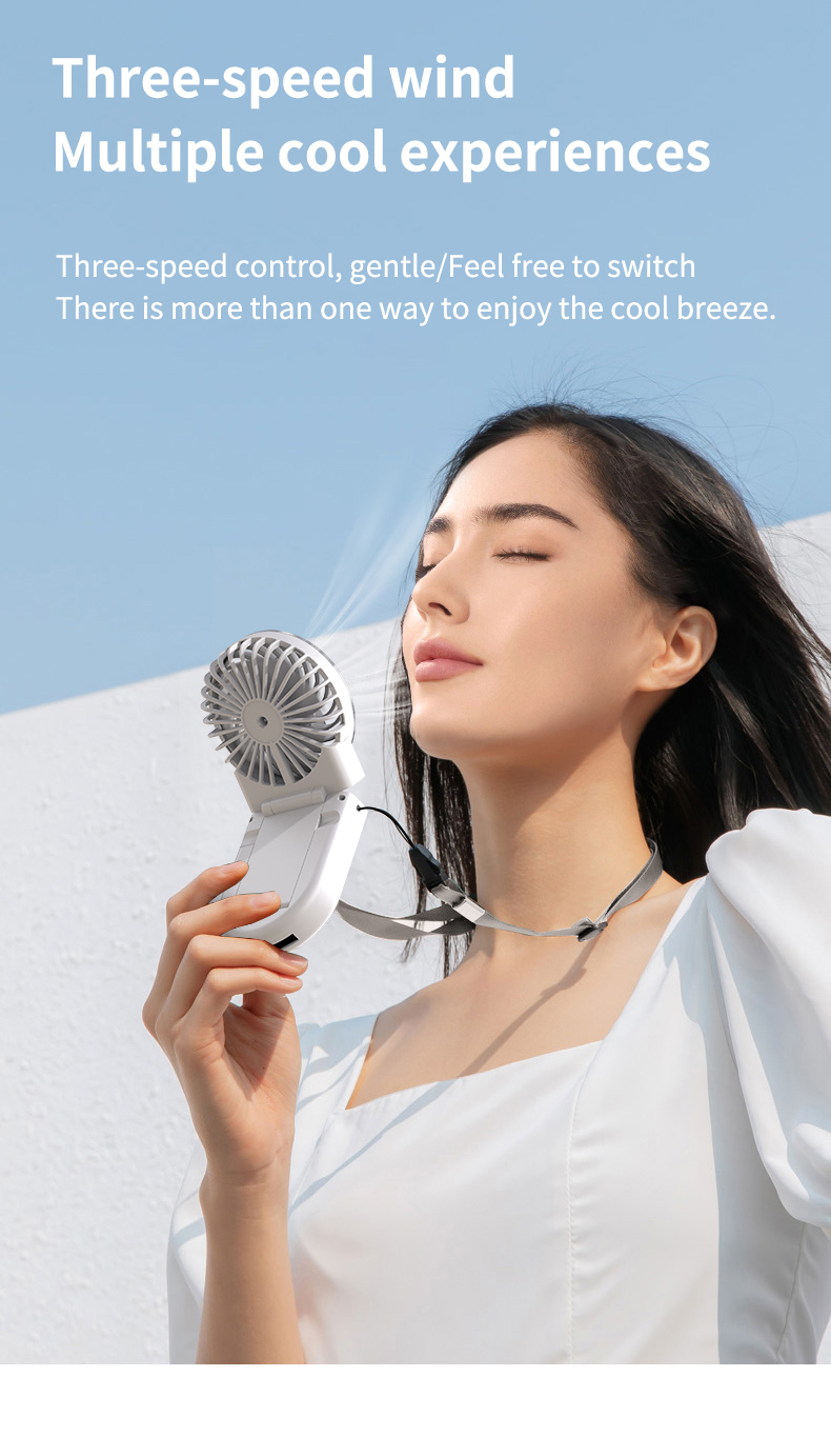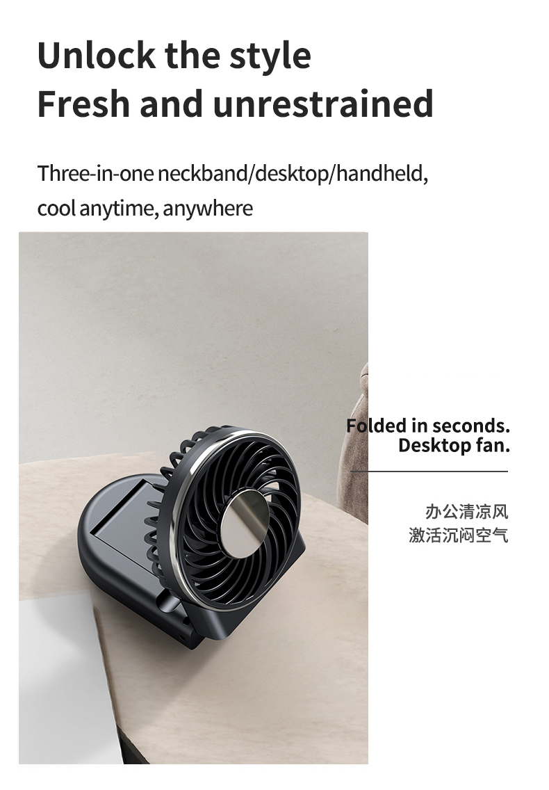 - Three-in-One Design: This versatile fan offers three modes of use: neckband, desktop, and handheld, ensuring maximum flexibility for your cooling needs. Whether you're working at a desk or strolling outdoors, you can stay cool effortlessly.