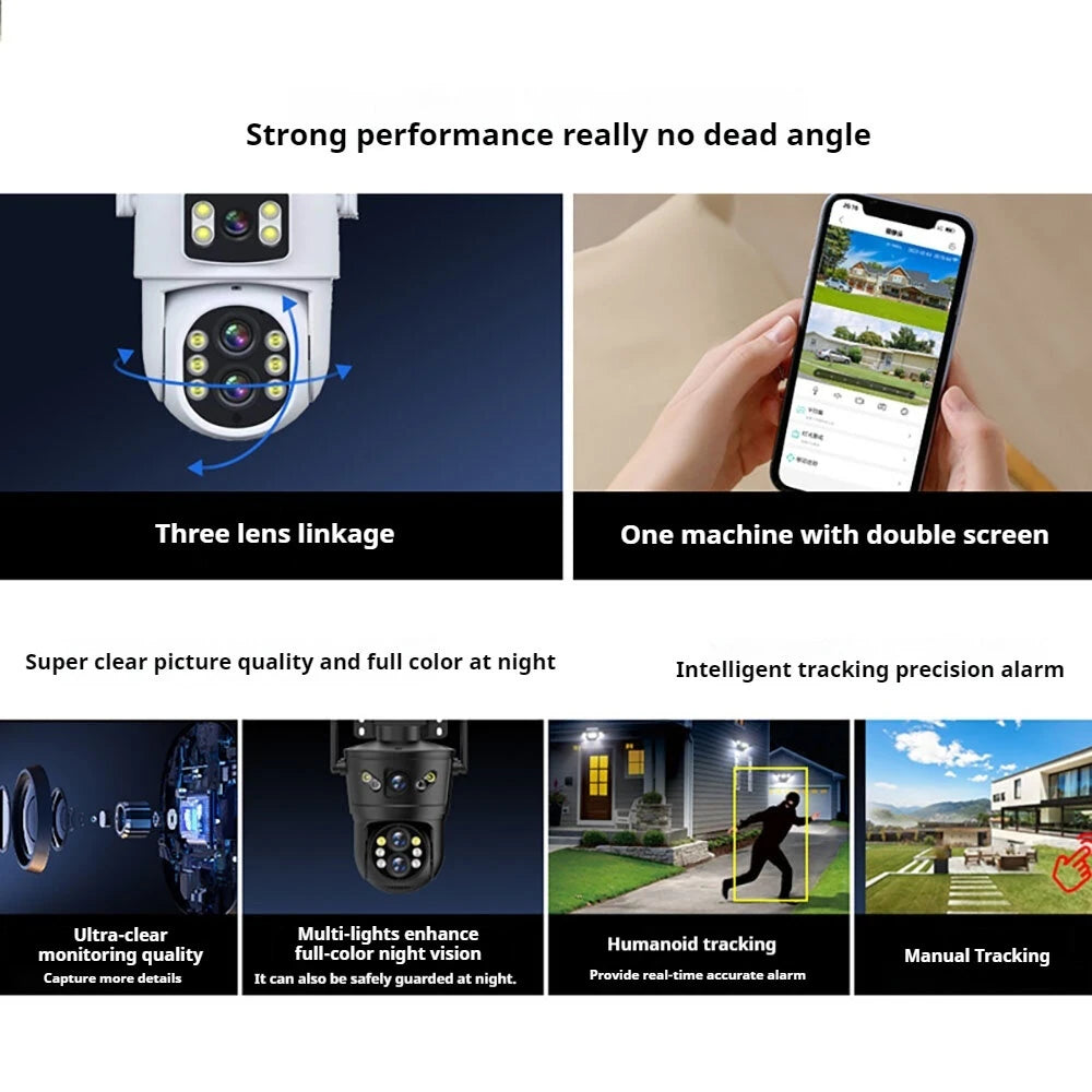 1. 3 Lens 2 Screens Observation: This advanced security camera is equipped with dual lenses, allowing simultaneous monitoring of two different angles. You can view a fixed area while panning another, providing comprehensive surveillance with a single device.