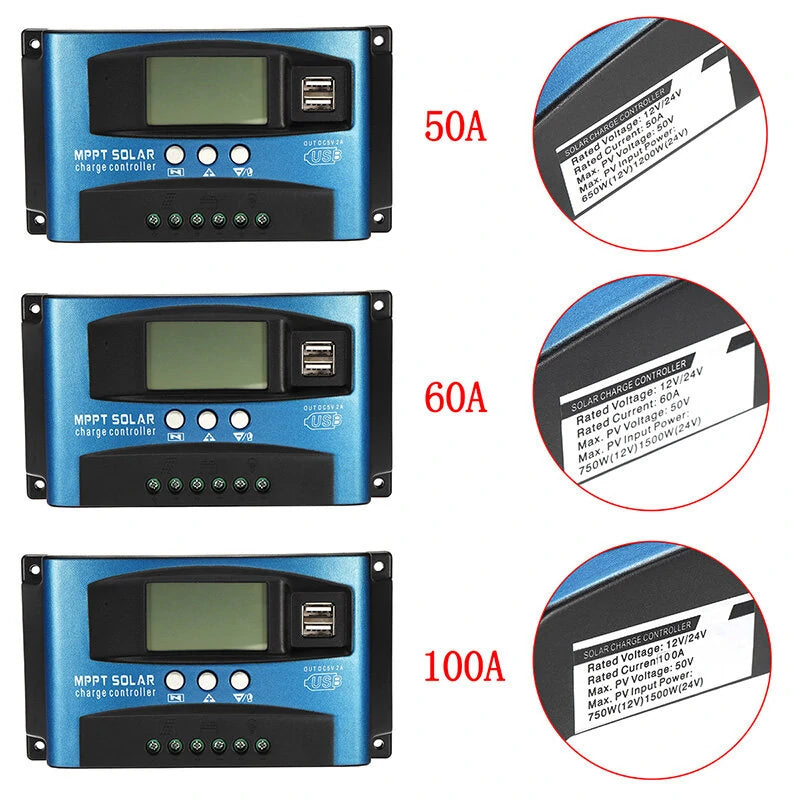 Rated current: 40/50/60/100A Max. PV voltage: 50V Max. PV input power: 750W(12V) / 1500W(24V)
