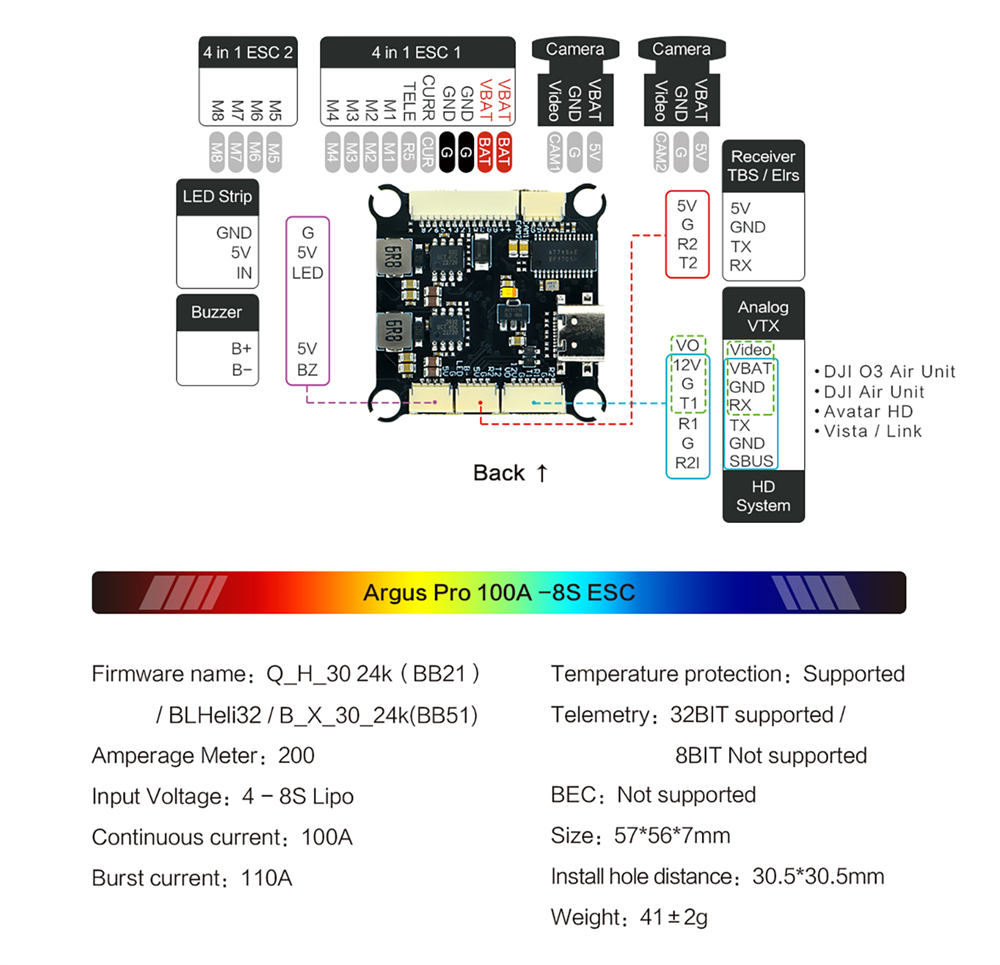 Firmware Name: Q_H_30 24k(BB21) / BLHeli32/ B_X_30_24k(BB51) Amperage Meter: 200 Input Voltage: 4-8S Lipo Continuous Current: 100A Burst Current: 110A Temperature Protection: Supported Telemetry: 32BIT Supported / 8BIT Not Supported BEC: Not Supported Size: 57*56*7mm Install Hole Distance: 30.5*30.5mm Weight: 41±2g |