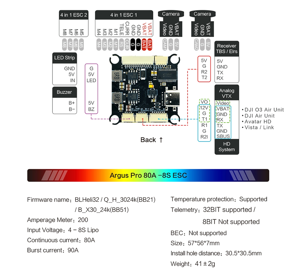 Firmware Name: BLHeli32/Q_H_3024k(BB21) /B_X30_24k(BB51) Amperage Meter: 200 Input Voltage: 4-8S Lipo Continuous Current: 80A Burst Current: 90A Temperature Protection: Supported Telemetry: 32BIT Supported / 8BIT Not Supported BEC: Not Supported Size: 57*56*7mm Install Hole Distance: 30.5*30.5mm Weight: 41±2g |