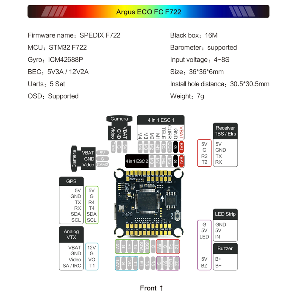 Firmware Name: SPEDIX F722 MCU: STM32 F722 Gyro: ICM42688P BEC: 5V3A/12V2A Uarts: 5 Set OSD: Supported Black Box:16M Barometer: Supported Input Voltage: 4~8S Size: 36*36*6mm Install Hole Distance: 30.5*30.5mm Weight: 7g |