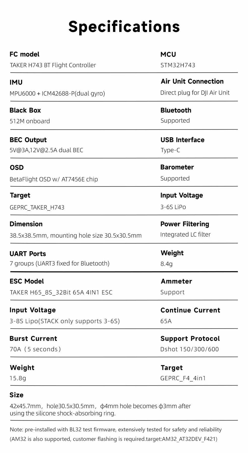 FC Model: TAKER H743 BT Flight Controller MCU: STM32H743 IMU: MPU6000 + ICM42688-P(dual gyro) Air Unit Connection: direct plug for DJI Air Unit Black Box: 512M onboard Bluetooth: Supported Barometer: Supported USB Interface: Type-C OSD: BetaFlight OSD w/ AT7456E chip BEC Output: 5V@3A,12V@2.5A dual BEC Target: GEPRC_TAKER_H743 Dimension: 38.5×38.5mm, mounting hole size 30.5×30.5mm Input Voltage: 3-6S LiPo UART Ports: 7 groups (UART3 fixed for Bluetooth) Power Filtering: Integrated LC filter Weight: 8.4g |