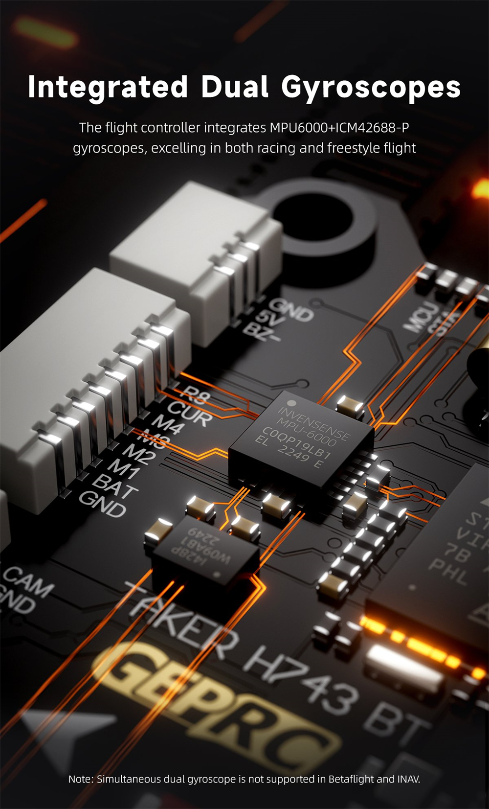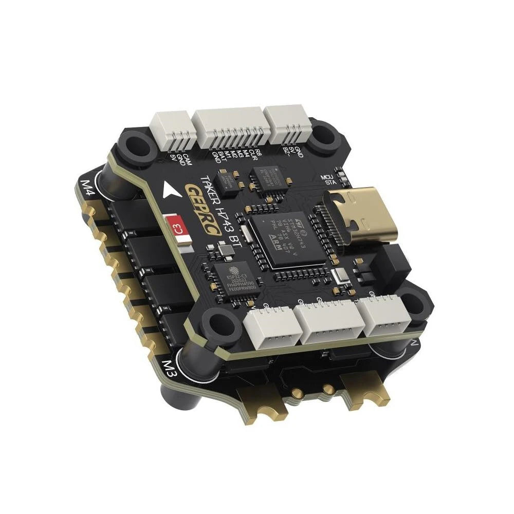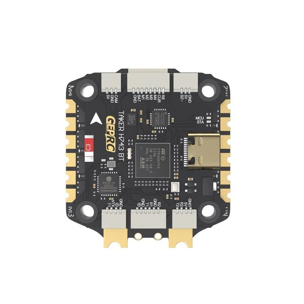 The TAKER H743 BT 32Bit 65A STACK is the latest stack system developed by the GEPRC team. It features a high-performance STM32H743VIH6 chip with a Cortex-M7 core running at up to 480MHz, handling both racing and freestyle flights with ease. Its dual gyroscope setup, using MPU6000 and ICM42688-P, ensures precise control. With integrated Bluetooth for wireless parameter adjustments and a built-in 512MB black box, it’s well-equipped. It also offers eight motor output ports and is compatible with X8 models.