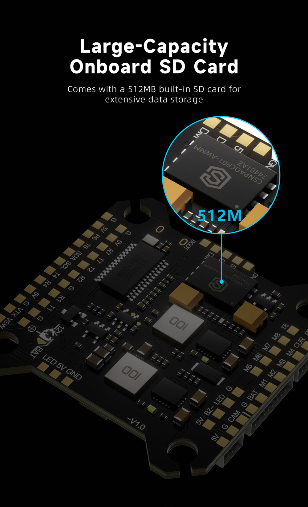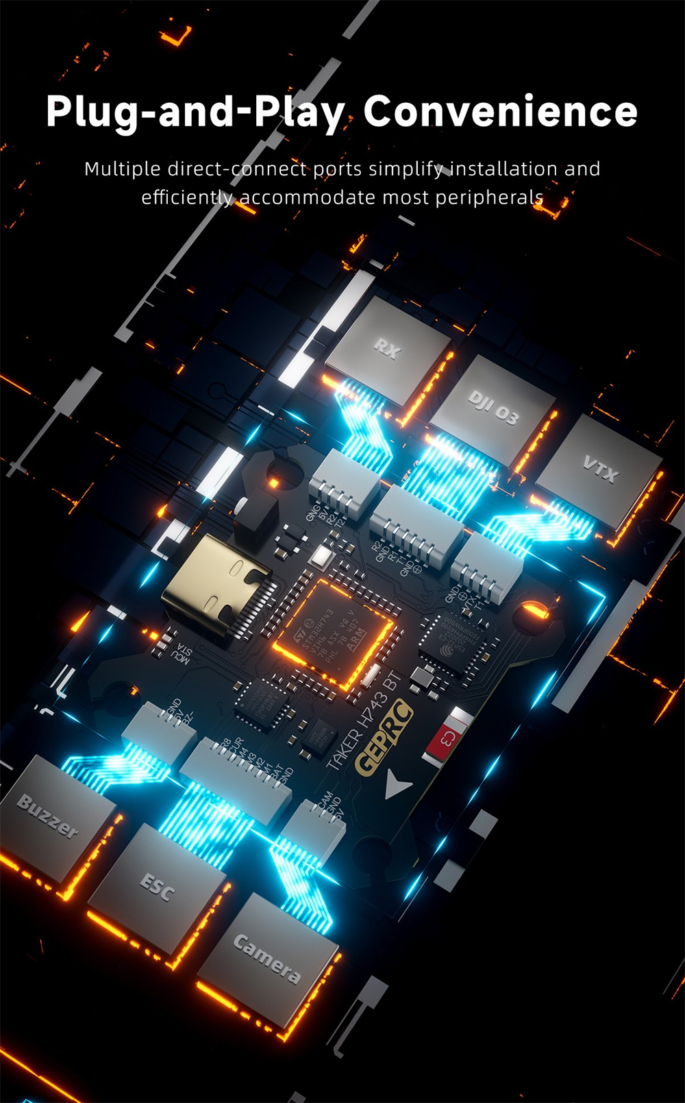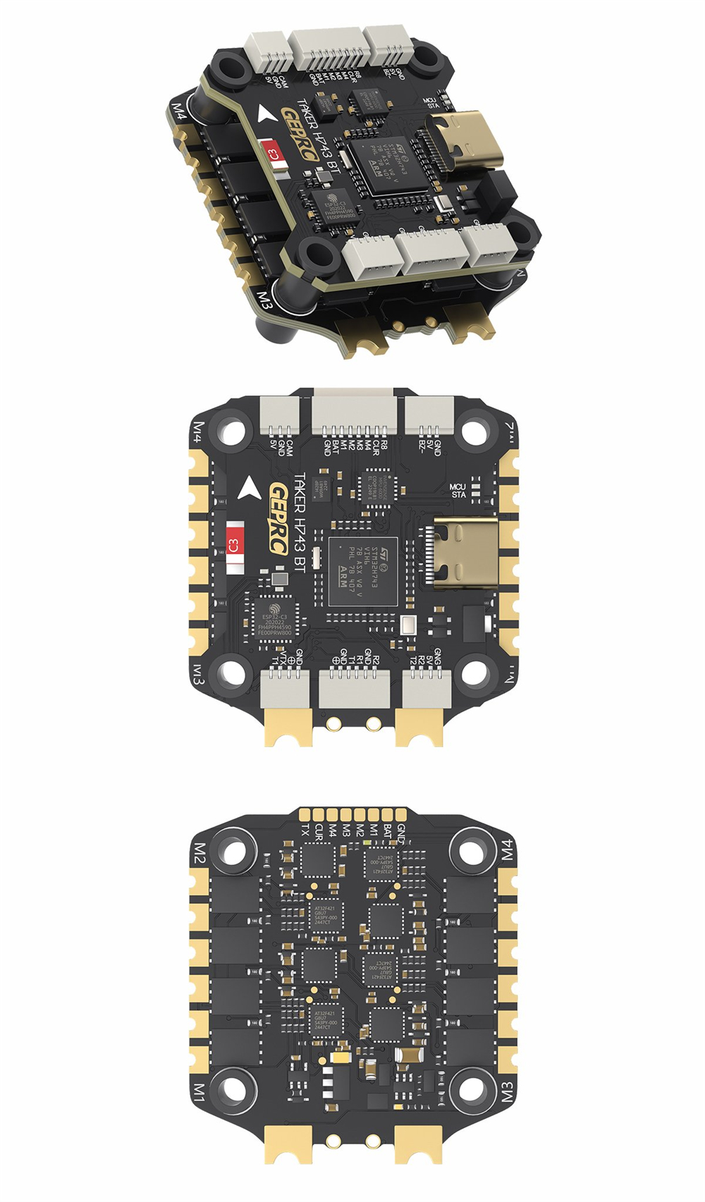 The TAKER H743 BT 32Bit 65A STACK is the latest stack system developed by the GEPRC team. It features a high-performance STM32H743VIH6 chip with a Cortex-M7 core running at up to 480MHz, handling both racing and freestyle flights with ease. Its dual gyroscope setup, using MPU6000 and ICM42688-P, ensures precise control. With integrated Bluetooth for wireless parameter adjustments and a built-in 512MB black box, it’s well-equipped. It also offers eight motor output ports and is compatible with X8 models.