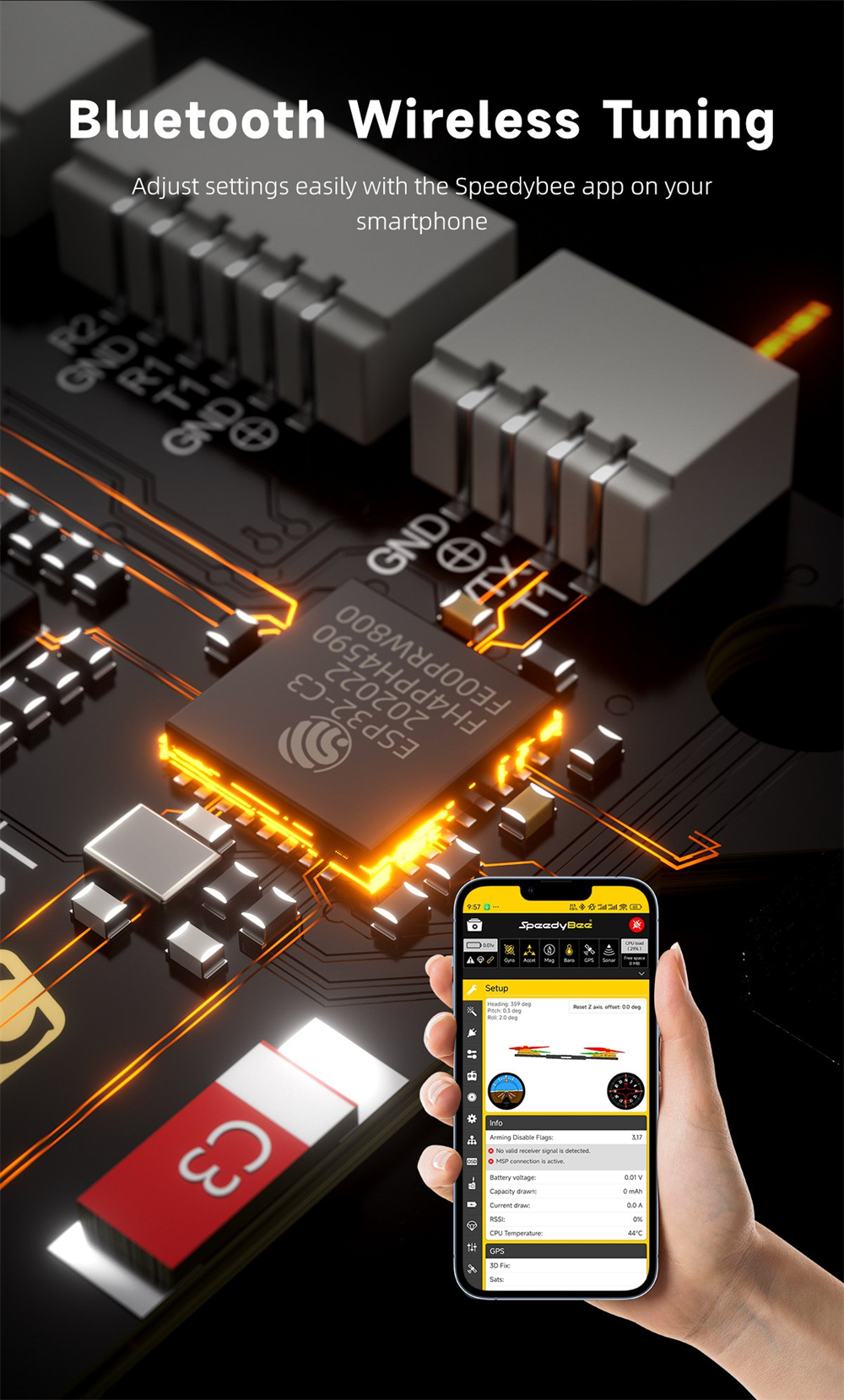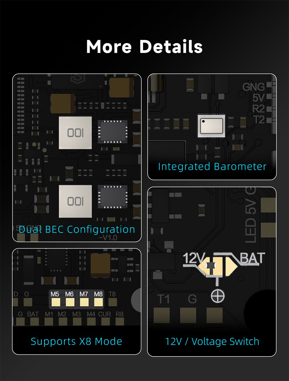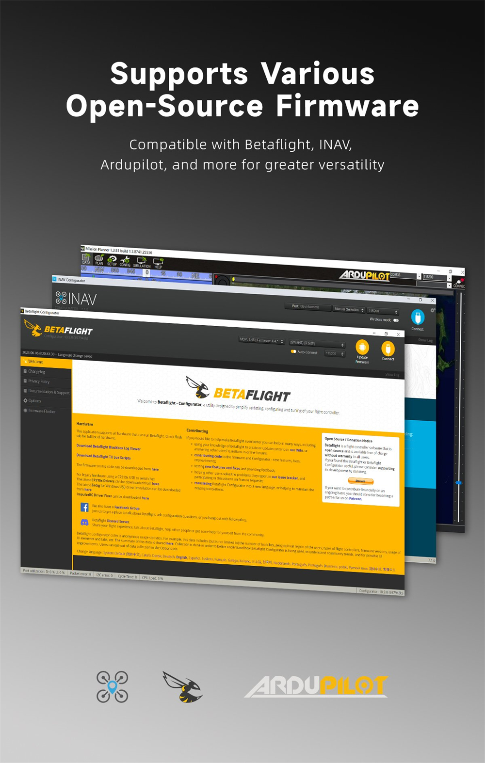 Compatible with Betaflight, INAV, and Ardupilot, it ensures flexibility. The dual independent 5V@3A + 12V@2.5A BEC ensures stable charging and motor voltage options. Features include seven UART ports, an integrated barometer, and plug-and-play functionality. With the TAKER H80_BLS 80A 4IN1 ESC, it delivers an exceptionally smooth flight experience.