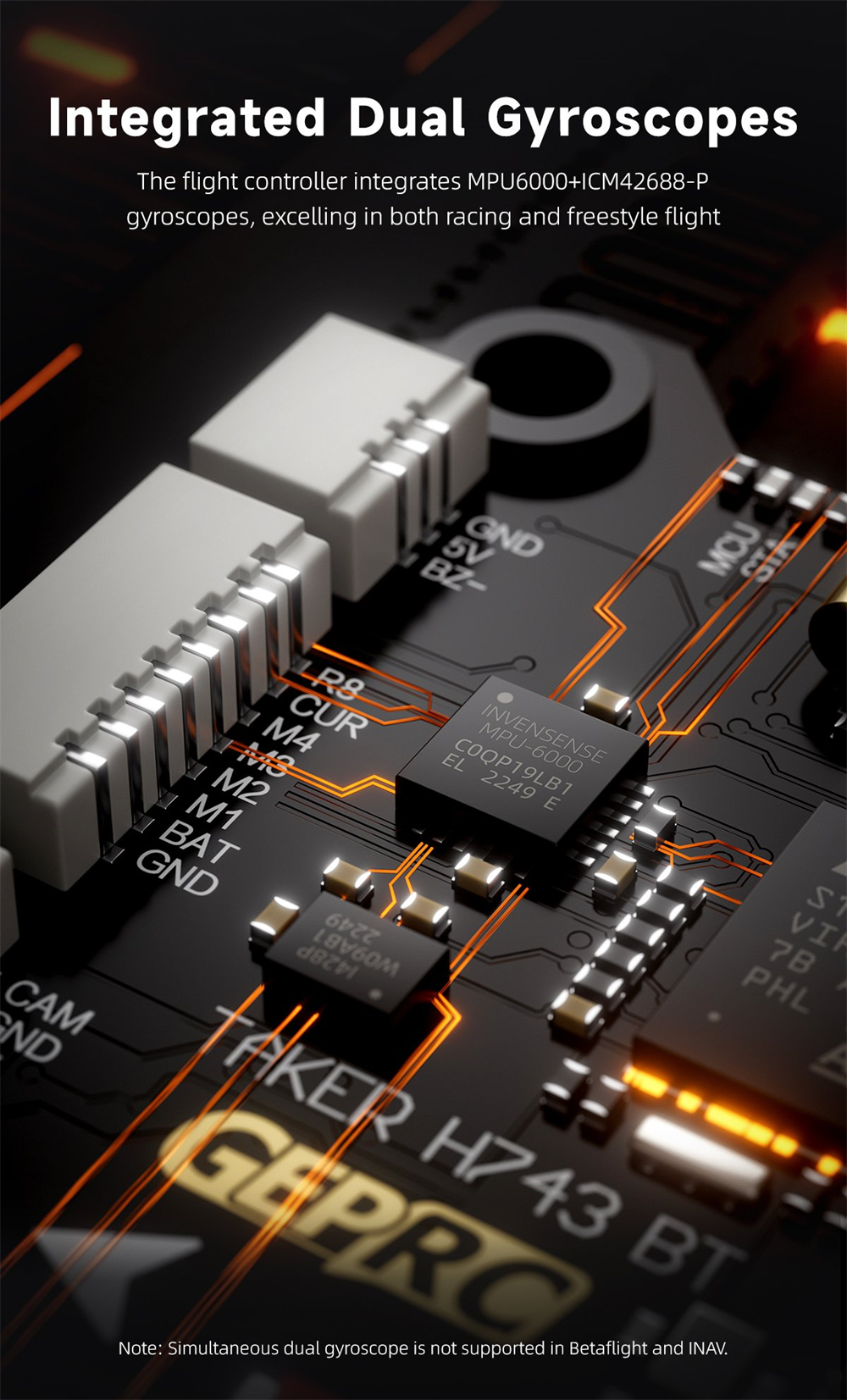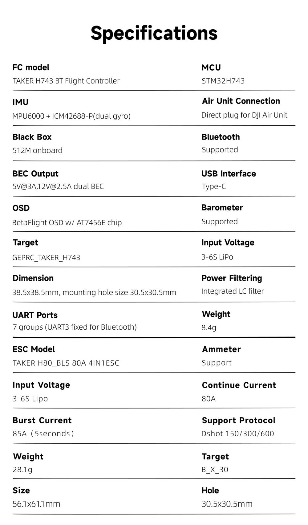 FC Model: TAKER H743 BT Flight Controller MCU: STM32H743 IMU: MPU6000 + ICM42688-P(dual gyro) Air Unit Connection: direct plug for DJI Air Unit Black Box: 512M onboard Bluetooth: Supported Barometer: Supported USB Interface: Type-C OSD: BetaFlight OSD w/ AT7456E chip BEC Output: 5V@3A,12V@2.5A dual BEC Target: GEPRC_TAKER_H743 Dimension: 38.5×38.5mm, mounting hole size 30.5×30.5mm Input Voltage: 3-6S LiPo UART Ports: 7 groups (UART3 fixed for Bluetooth) Power Filtering: Integrated LC filter Weight: 8.4g |
