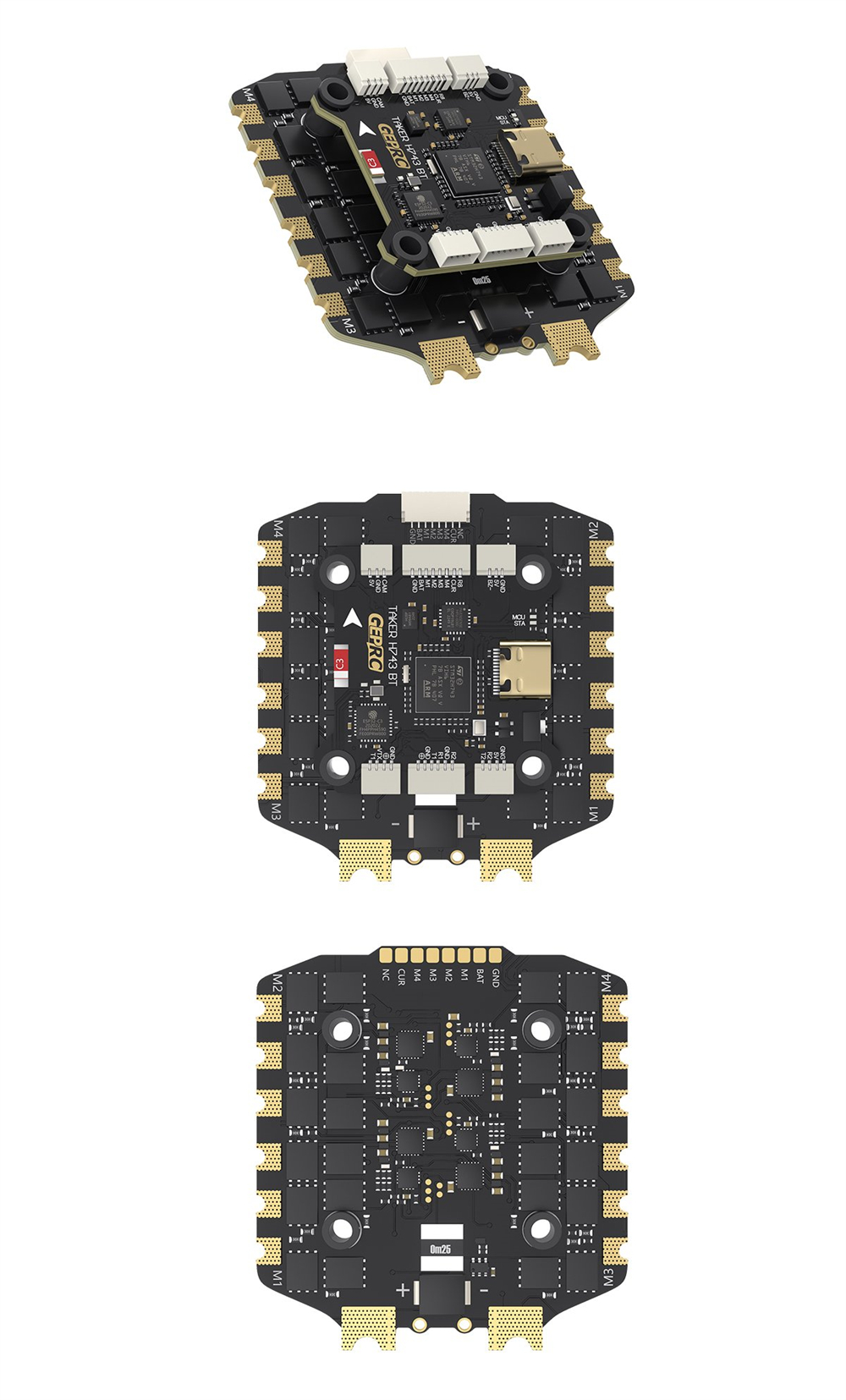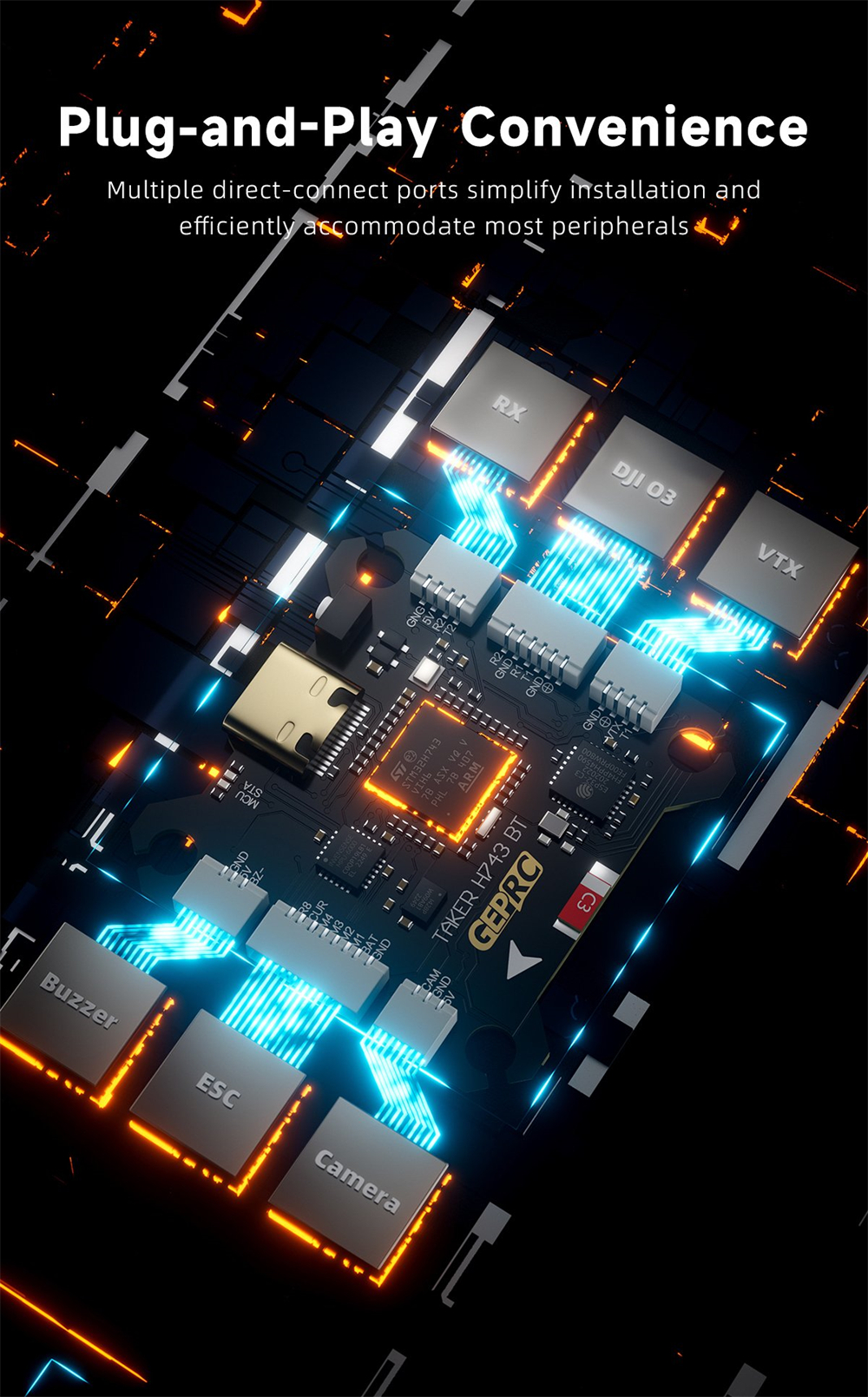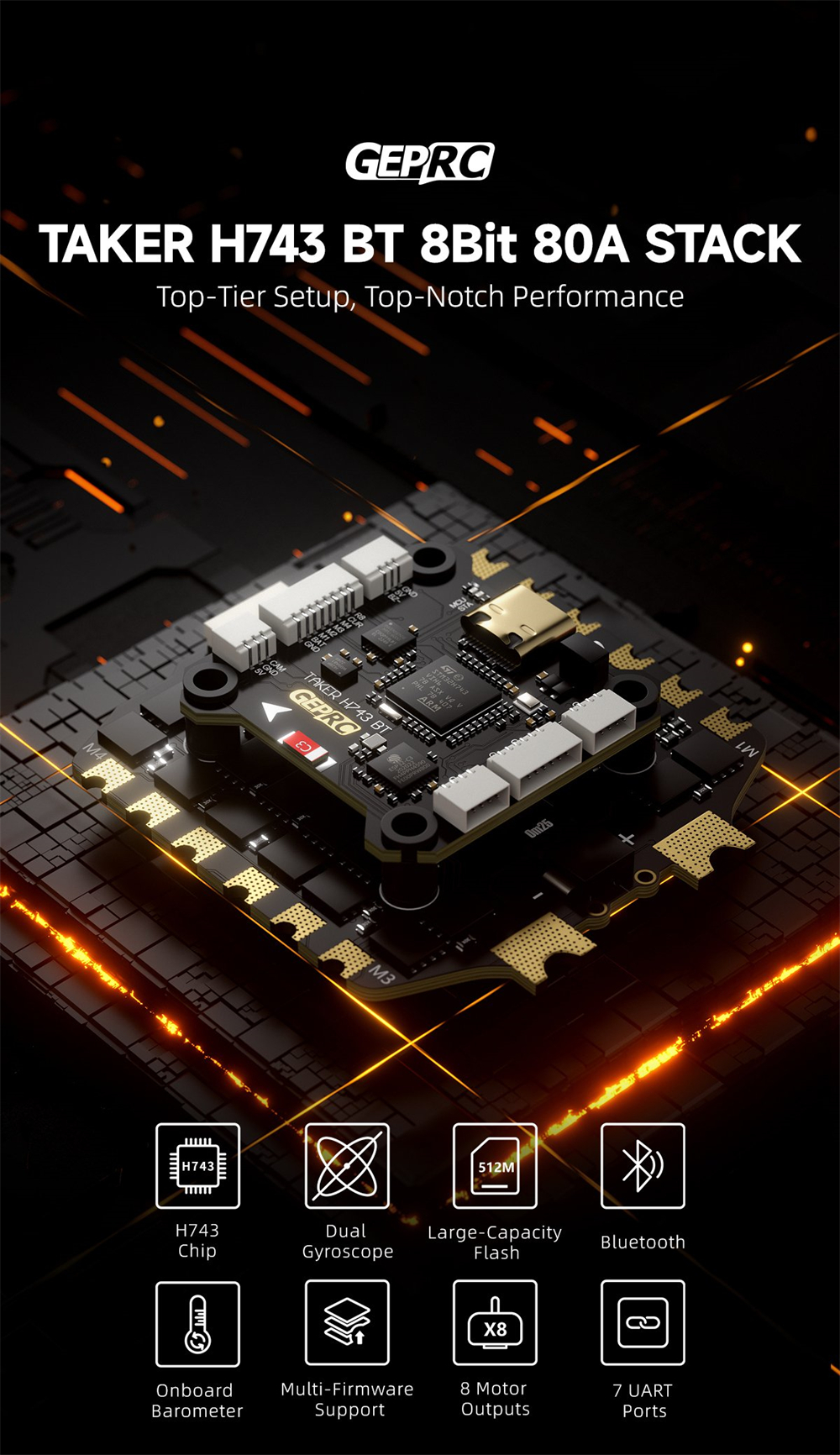 TAKER H743 BT 8Bit 80A STACK is the latest Stack system developed by the GEPRC team. It features a high-performance STM32H743VIH6 chip with a Cortex-M7 core running at up to 480MHz, handling both racing and freestyle flights with ease. Its dual gyroscope setup, using MPU6000 and ICM42688-P, ensures precise control. With integrated Bluetooth for wireless parameter adjustments and a built-in 512MB black box, it’s well-equipped. It also offers eight motor output ports and is compatible with X8 models.