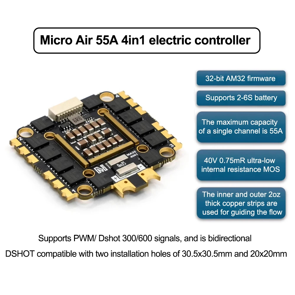 - Built-in 32-bit AM32 firmware ensures precise performance control and smooth operation.