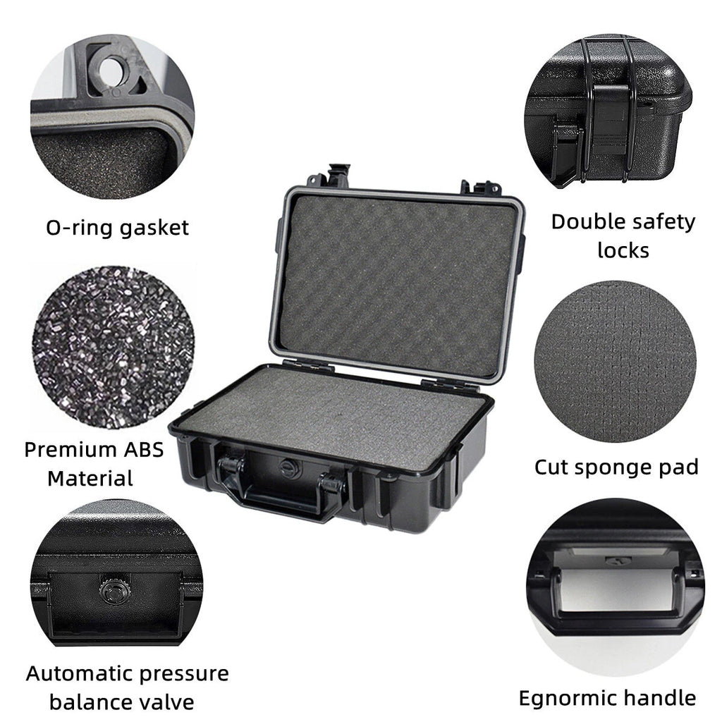 Specifications:Material: ABS, SpongeColor: BlackSize: outside: 363*290*160mm (14.3'x11.4'x6.3')inside: 326*246*150mm (12.8'x9.7'x5.9')Features:- Excellent shockproof, waterproof, dustproof function.- Widely used in aviation, outdoor photography, field investigation, scientific exploration and many other fields.- Composite buckle, the use of stretching process, smart, convenient, strong, to prevent the collapse of the box.Package included:1 X Box with spongeNote: Please allow slight 1-3cm difference due to manual measurement and a little color variation for different display setting. The pictures are only for reference, please make the object as the standard. Thank you for your understanding!