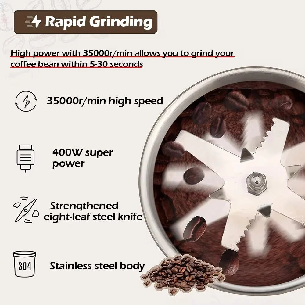 - High-Power Electric Coffee Grinder: Powered by a 400W motor with over 35,000 rpm, this electric coffee grinder ensures efficient and easy grinding.