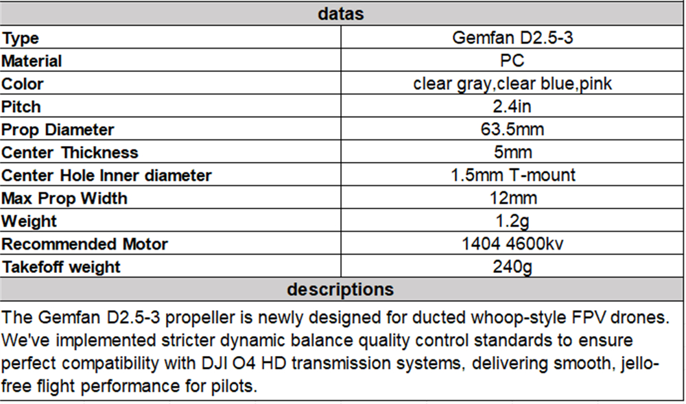 The Gemfan D2.5-3 propeller is newly designed for ducted whoop-style FPV drones. We've implemented stricter dynamic balance quality control standards to ensure perfect compatibility with DJI O4 HD transmission systems, delivering smooth, jello-free flight performance for pilots.