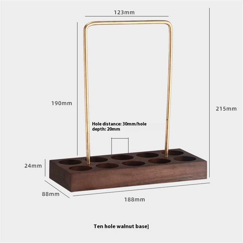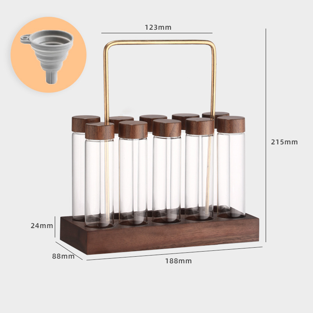 10-Slot Holder: 10 x Glass Tube, 1 x Walnut Wood Base, 1 x Brass Handle, 1 x Funnel