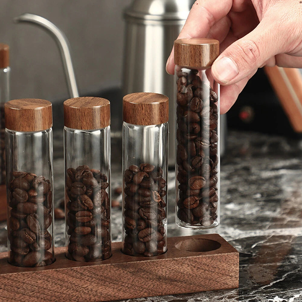 Each tube features a precision-fit wooden lid designed to maintain the aroma and freshness of stored ingredients.