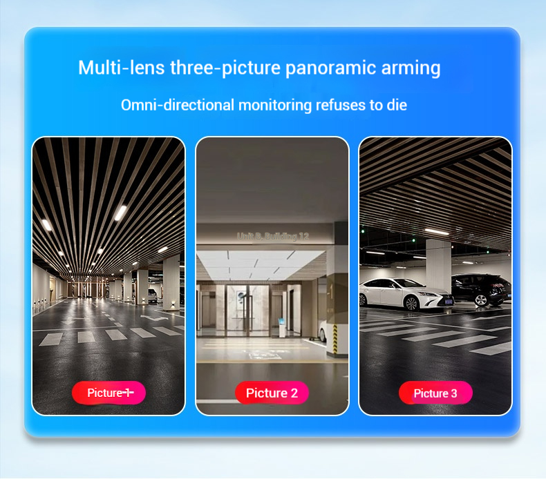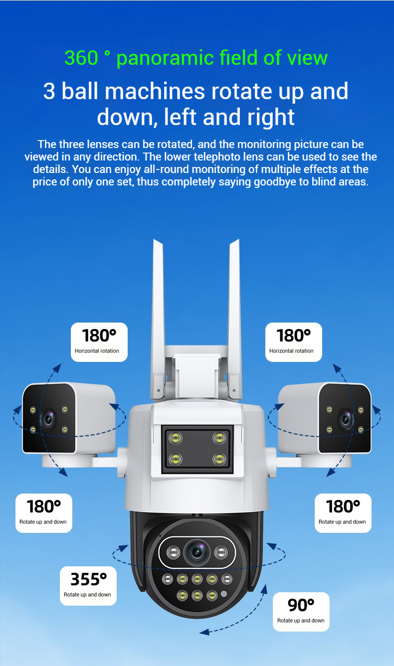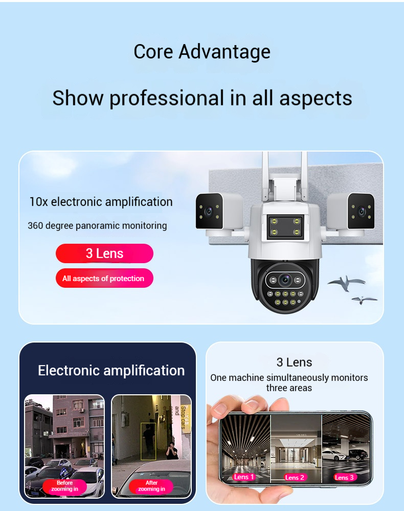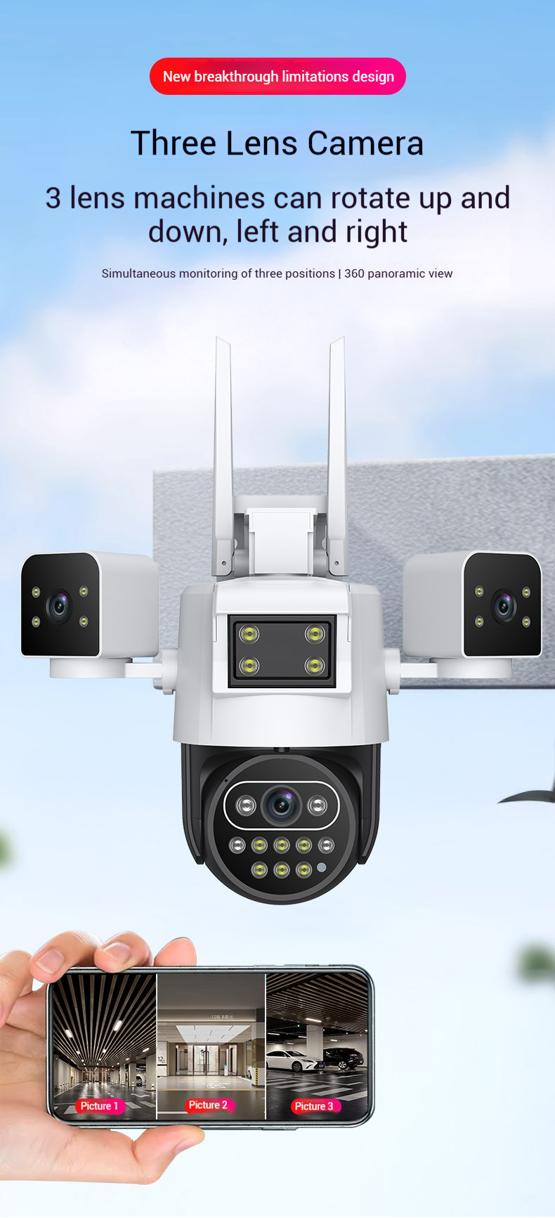1. Three-Lens Triple View: This innovative camera features three lenses, providing a comprehensive overview of your property. Each lens can be independently controlled and adjusted for maximum coverage, ensuring no blind spots. The setup allows you to monitor different angles simultaneously, offering an all-encompassing surveillance solution.