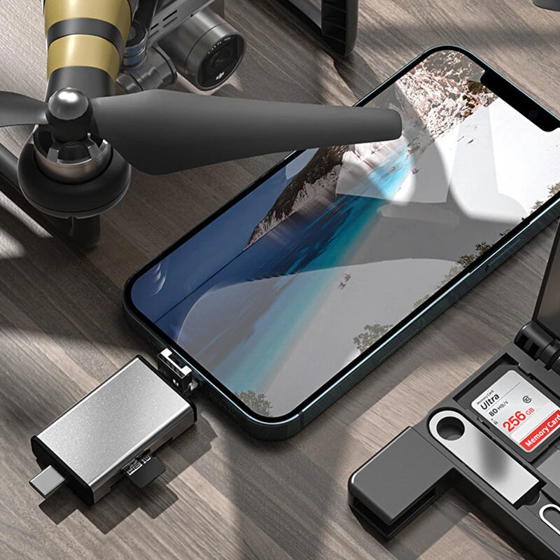 1. Multifunctional 7-in-1 Design :This card reader storage box is a multifunctional 7-in-1 device, combining a TF card reader, USB2.0 Type-C adapter, and OTG adapter in one compact unit.