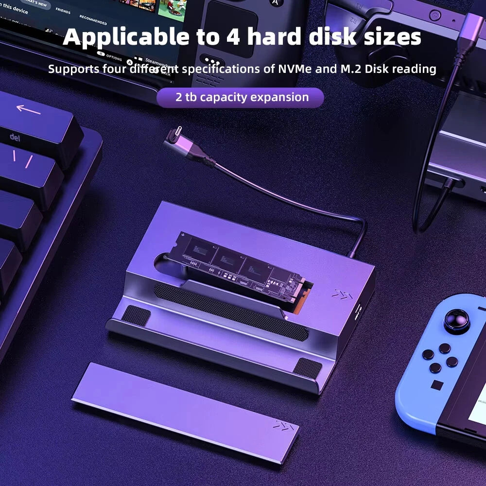 Model: cs-032Input: Type-COutput: 2*USB3.0 A/F(5 Gbps)1*USB2.0 A/F(480Mbps)1*RJ45 (1000M)1*HD(4K 60Hz)1*Type-C/F(PD 100W)1 x M.2 5Gbps card slot (compatible with NVMe and SATA disks, supporting a maximum of 2T capacity.Compatible with M.2 solid state disk 2230 2242 2260 2280 different specifications port dimensions)Size:139.5x94x28.5mmMaterial: Aluminum alloy, ABSCompatibility: For Steam Deck
