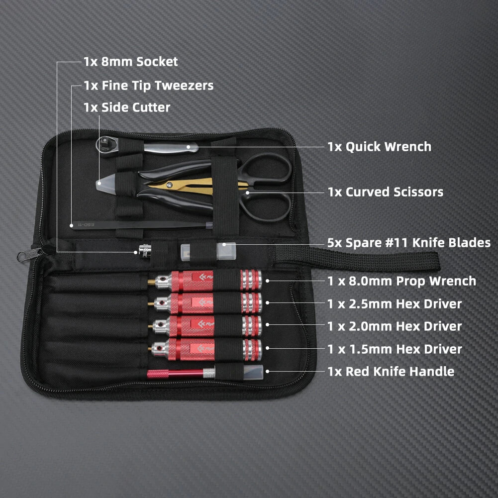 1x 1.5mm Hex Driver1x 2.0mm Hex Driver1x 2.5mm Hex Driver1x 8.0mm Prop Wrench1x Red Knife Handle5x Spare #11 Knife Blades1x Quick Wrench1x 8mm Socket1x Curved Scissors1x Side Cutter1x Fine Tip Tweezers1x Tool Case