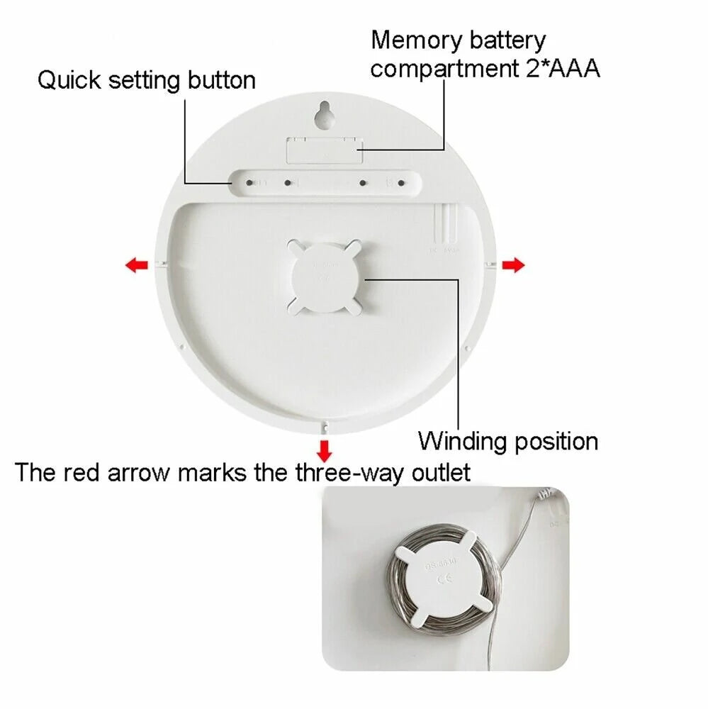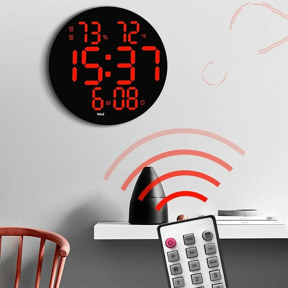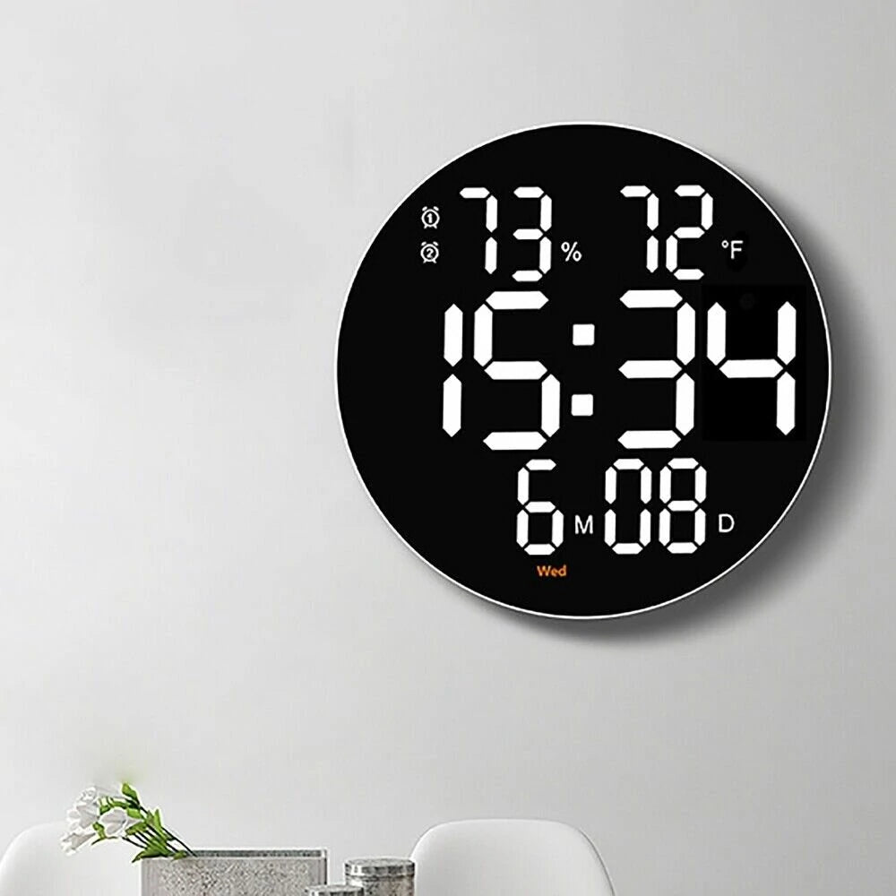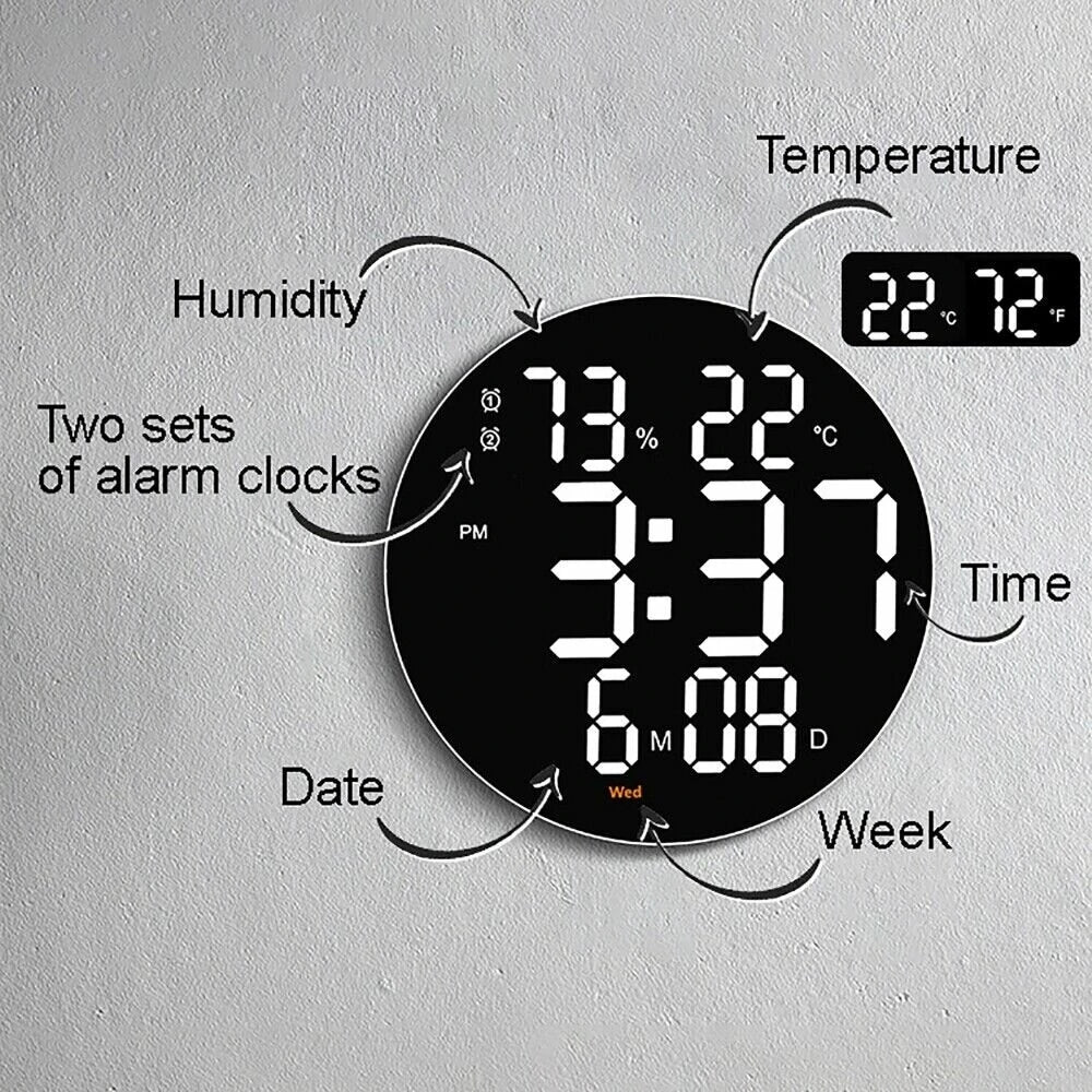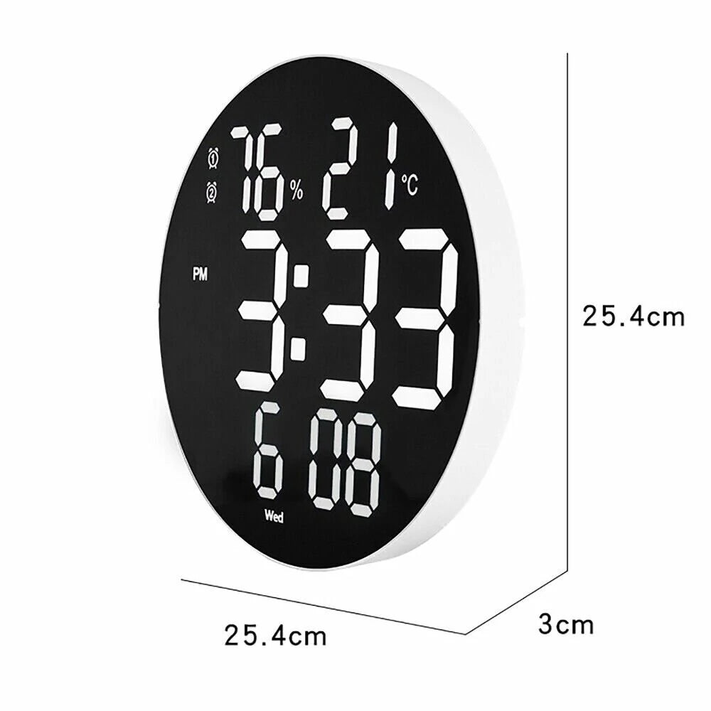 Features:1. [Large digital frame alarm clock] The alarm clock has an electronic alarm clock with intelligent dimming LED screen, time, temperature, and date are displayed in large numbers on the same screen, and the brightness can be adjusted in 10 levels. Don't worry about the brightness affecting sleep. Even the visually impaired can easily check the time.2.【Memory Function】When the external power of our clock is turned off, the retention time and various settings will not change. After turning off the external power supply, the time will not be displayed, avoiding repeated settings next time.3.【Stylish and Concise】This must be the most exquisite alarm clock you have ever seen. It is not only a clock but also a great decoration for your bedroom. It can be used on a table or mounted on a wall. Stylish appearance and multiple functions, suitable as a gift for kids and families.Descriptions:Name: Wall ClockDisplay type: digitalApplicable places: living room, bedroom, study, office, kitchen, public places, othermaterial: plasticSpecial features: decoration, thermometer, perpetual calendar, alarm, countdown, 24-hour indication, humidity measurementAppearance shape: roundDimensions: 25.4x25.4x3cmStyle: modern minimalistPower type: external power supplyDisplay type: LEDPackage list:1 x Digital Wall Clock1 x Remote controller1 x USB cable