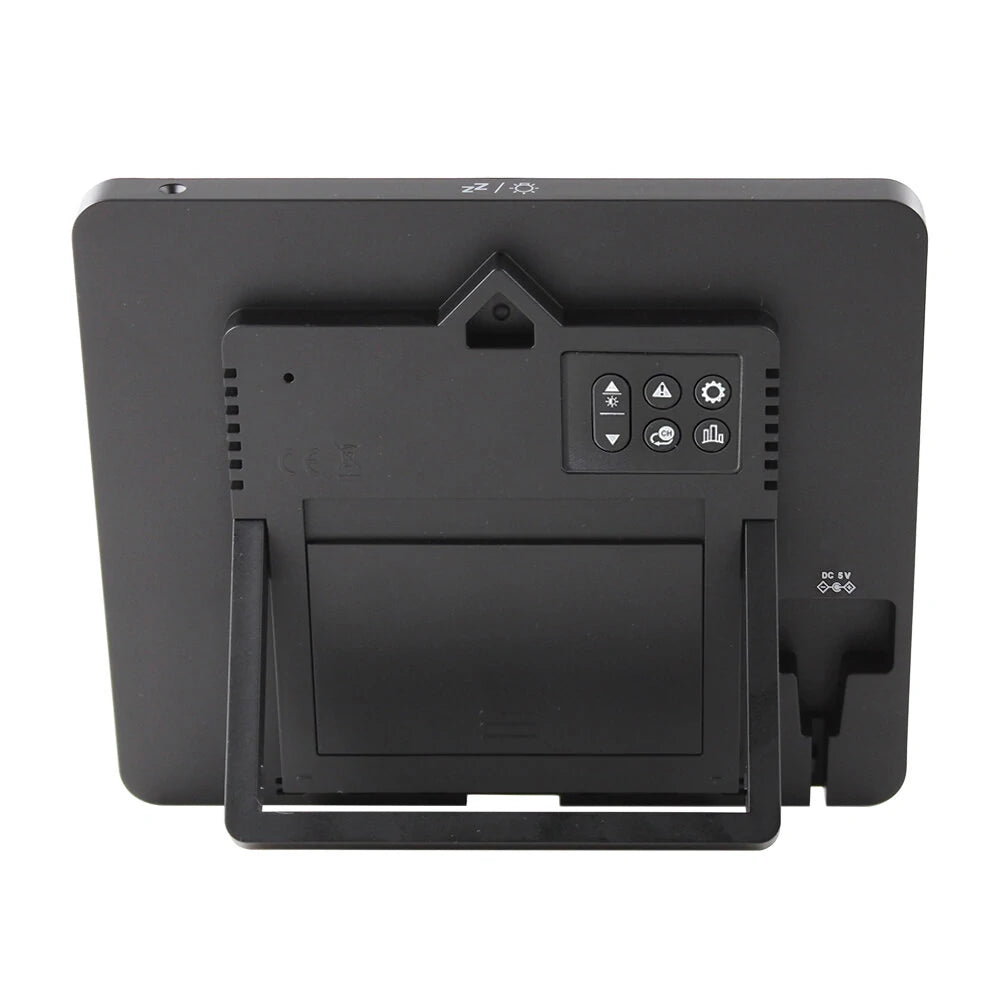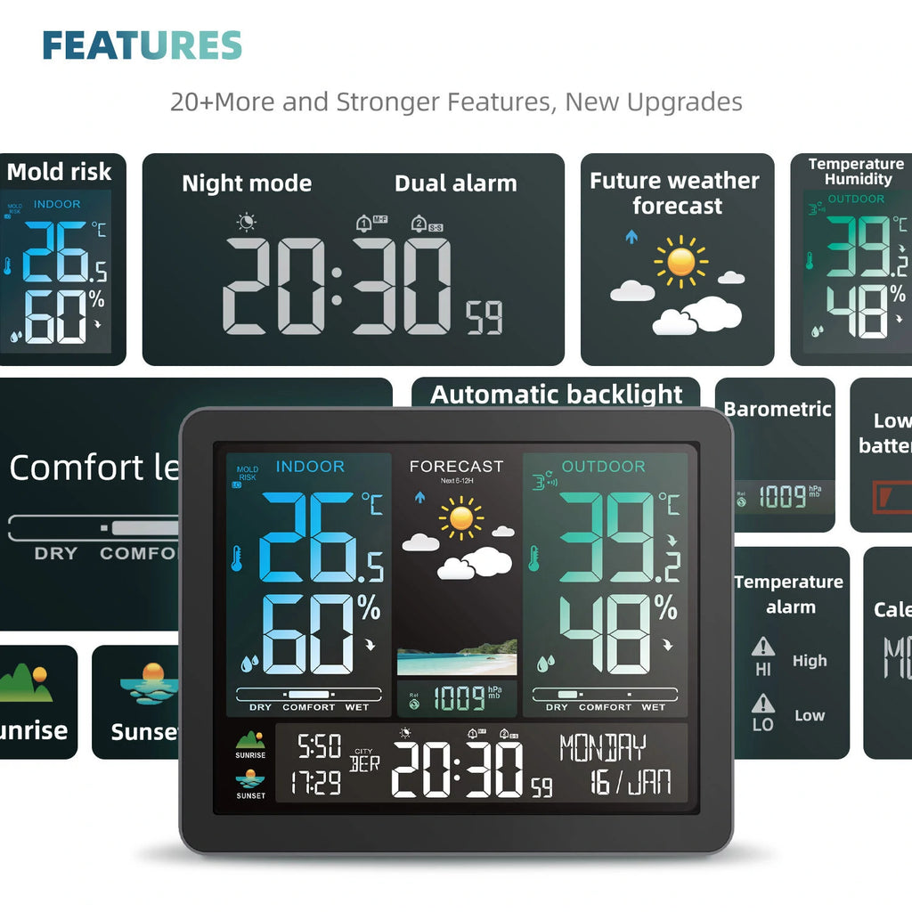 4. Display indoor level 3 mildew risk warning. Display indoor and outdoor comfort level 5. With indoor and outdoor temperature and humidity upper and lower limit alarm and frost point alarm functions. OUTDOOR remote wireless transmitter is attached, which supports receiving up to 3 sets online at the same time.5. Temperature display format selection (℃/℉). It can detect the trend change of temperature and humidity. Check the indoor and outdoor records of the maximum and minimum temperature and humidity on that day.6. The bar chart shows the trend of atmospheric pressure in the past 3, 6, 9, 12, 18 and 24 hours. Check the trend change of level 3 air pressure.7. Backlight function: when the battery is powered, the backlight lights up for 15 seconds. When DC-POWER supplies power, the backlight is divided into 5 levels of brightness (high → low 4 levels, off). With night exposure mode (adjust brightness intelligently according to dim ambient light)Specifications:Time calendar shows: January 1, 2000 ~ December 31, 2099.Time standard is 12HR/24HR8 languages show the week and three-character month abbreviations: Britain, Ge rmany, France, Italy, Spain, Netherlands, Denmark and Poland.Temperature detection range:INDOOR:-9.9℃ ~ +50℃ & +14℉ ~ +122℉OUTDOOR: -40℃ ~ +70℃ & -40℉ ~ +158℉Indoor and outdoor humidity detection range: 20% ~ 95%Indoor temperature and humidity detection cycle: 60 seconds/time.Selection of air atmospheric pressure unit: mb/hPa or inHg.Air atmospheric pressure display range: 600 HPA/MB ~ 1100 HPA/MB & 17.72 INHG ~ 32.48 INHG.6 kinds of weather forecast: sunny, cloudy, cloudy, light rain, heavy rain and snowy days.Power Supply: