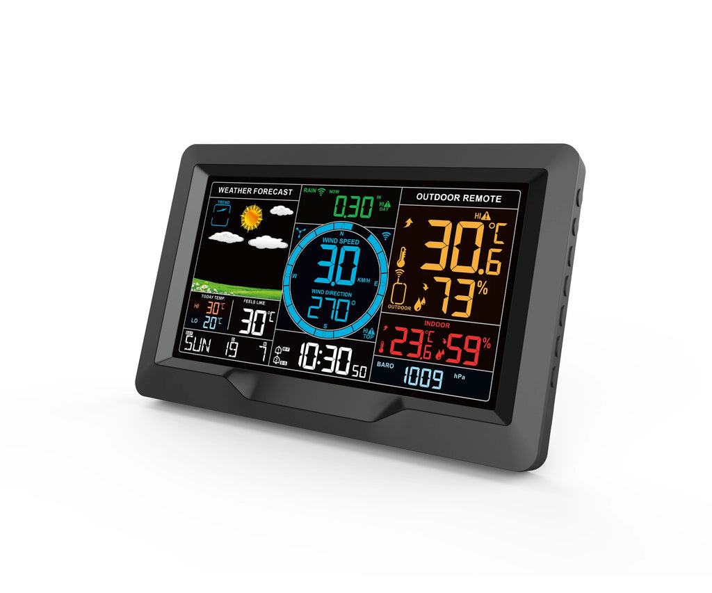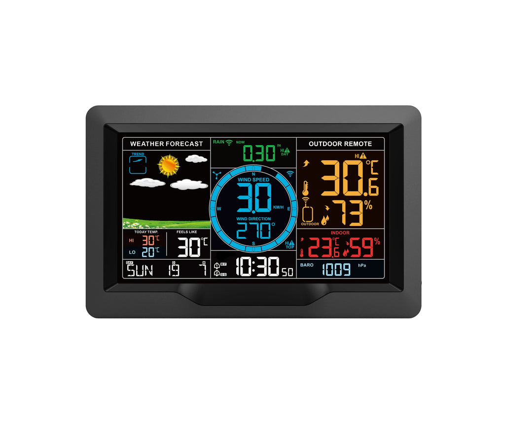 Features:Time/date display. Perpetual Calendar Up to Year 2099Eight-nation week language selection (English, German, French, Italian, Spanish, Dutch, Danish, Russian)Two daily alarms and automatic snooze function (OFF or 5~60min, its alarm time, alarm period, snooze time and snooze times can be set)Warning functions such as upper and lower limits of temperature and humidity, upper limit of wind speed and upper limit of rainfall.Display of somatosensory temperature, wind chill index, thermal index and dew point temperature. (converted from temperature and humidity, air pressure, wind speed, etc. detected in the machine)ASK receives remote transmitter signal (100m signal transmission).Class 3 backlight (brightness can be adjusted when powered by usb, and the screen can only be lit for 15 seconds when powered by battery)Mainframe power supply: usb cable powered DC 5V1.2A, battery: 2 * AA batteries (not included in the shipment). Outdoor Sensor power supply: 3 * AA batteries (not included in the shipment)Multi-combination wireless Outdoor Sensor: 433 . 92MHZ RF transmitting frequency. 100 meters ( 300 feet ) transmission range in an open areaSpecifications:Color: BlackMaterial: ABSIndoor temperature detection range: 0 ~+50℃(32 ~ 122 ℉)Indoor humidity detection range: 20 ~ 95%Indoor temperature and humidity detection cycle: 60S.Outdoor temperature detection range:-40 ~+70℃(-40 ~ 158 ℉)Outdoor humidity detection range: 20 ~ 95%Air pressure detection range: 600 ~ 1100 HPA ( 17.72 ~ 32.48 INHG & 450 ~ 825.1 mmHg)Wind speed detection range: 0 ~ 180 km/h(0 ~ 111 mph)Wind direction detection range: 0 ~ 359 degreesRainfall detection range: 0 ~ 9999mm & 0 ~ 393.7in.Host Size: 20.5 * 13 * 3 cm / 8.07 * 5.12 * 1.18 inchSensor Size: 38 * 30 * 9 cm / 14.96 * 11.81 * 3.54 inchPackage Size: 37.8 * 13.5 * 27.2 cm / 14.88 * 5.13 * 10.7 inchPackage Weight: 1693g / 59.72ozPackage Included:1 * Weather Station1 * USB Power Cable1 * Outdoor Sensor for Wind Speed and Rainfall1 * Instruction Manual (EN/DE/FR/IT/ES)1 * Installation Accessories